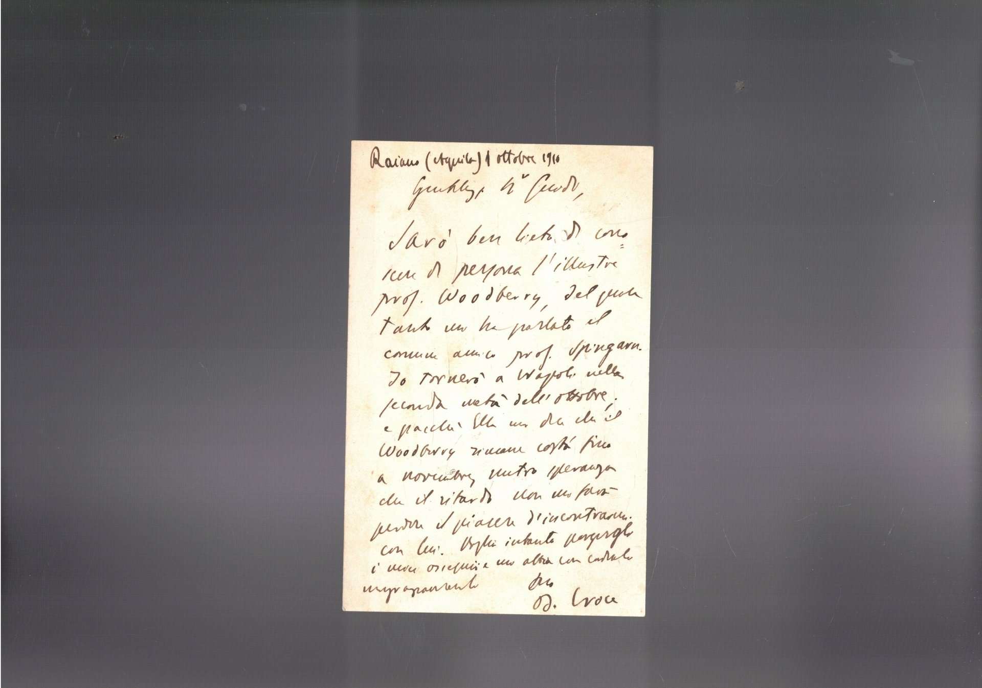 Cartolina su carta intestata della Laterza che pubblicizza "La Critica" inviata ad Angelo Flavio Guidi a Sorrento il 1 Ott. 1910 e spedita da Raiano Aq, Con messaggio sul retro che auspica di incontrare il critico letterario americano prof. Woodberry nel novembre a Napoli.