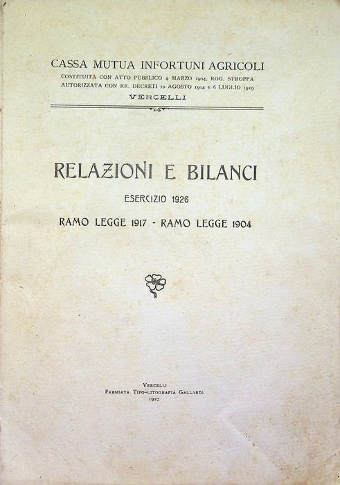 Cassa mutua infortuni agricoli: Vercelli: Relazioni e bilancio: esercizio 1926: ramo legge 1917 - ramo legge 1904.