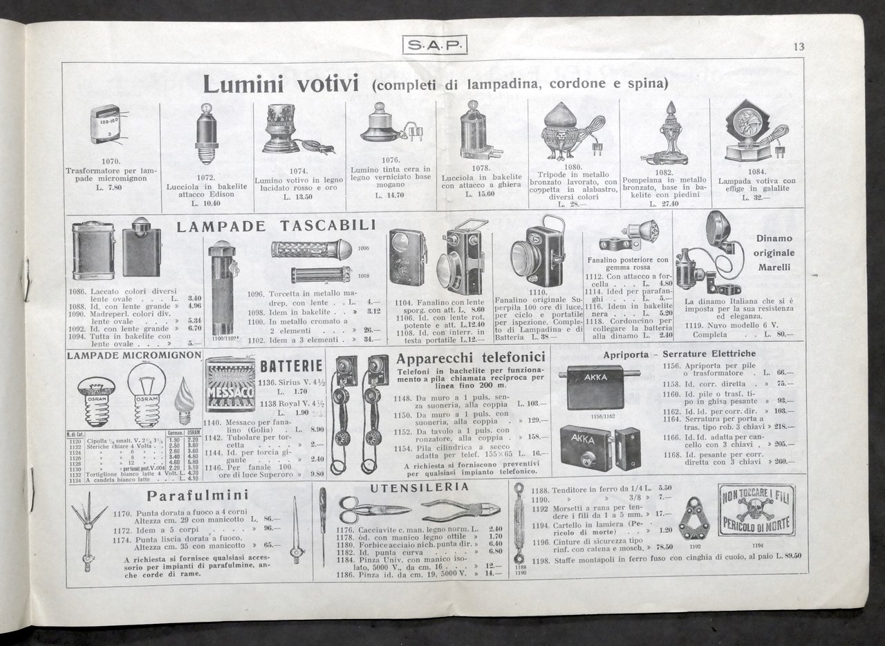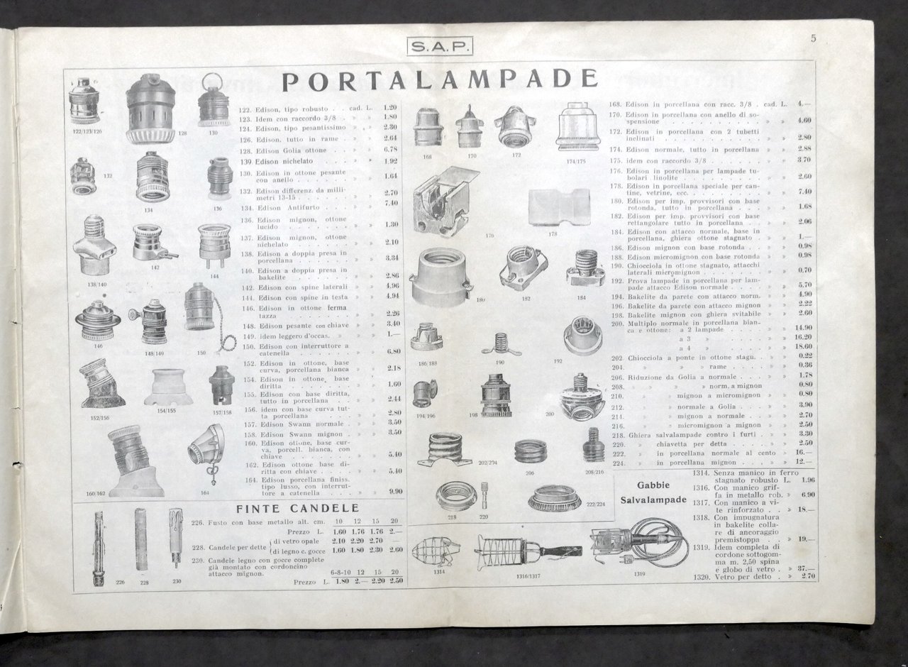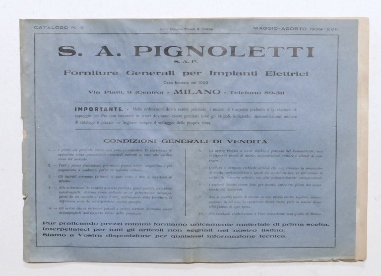 Catalogo d' epoca della dittà Pignoletti di Milano che si occupava delle forniture generali per impianti elettrici. Sono presente all' interno del catalogo lampade Leubi, Osram, Philips, conduttori elettrici Pirelli, portalampade, interrutori, lampade tascabili, lampadari e tanto altro. Il catalogo è datato 1939. Pagine 23 riccamente illustrate       Condizioni molto buone con piccoli segni del tempo; sulla parte non stampata della prima pagina presenta una piccola mancanza ! Per appassionati, studiosi e collezionisti