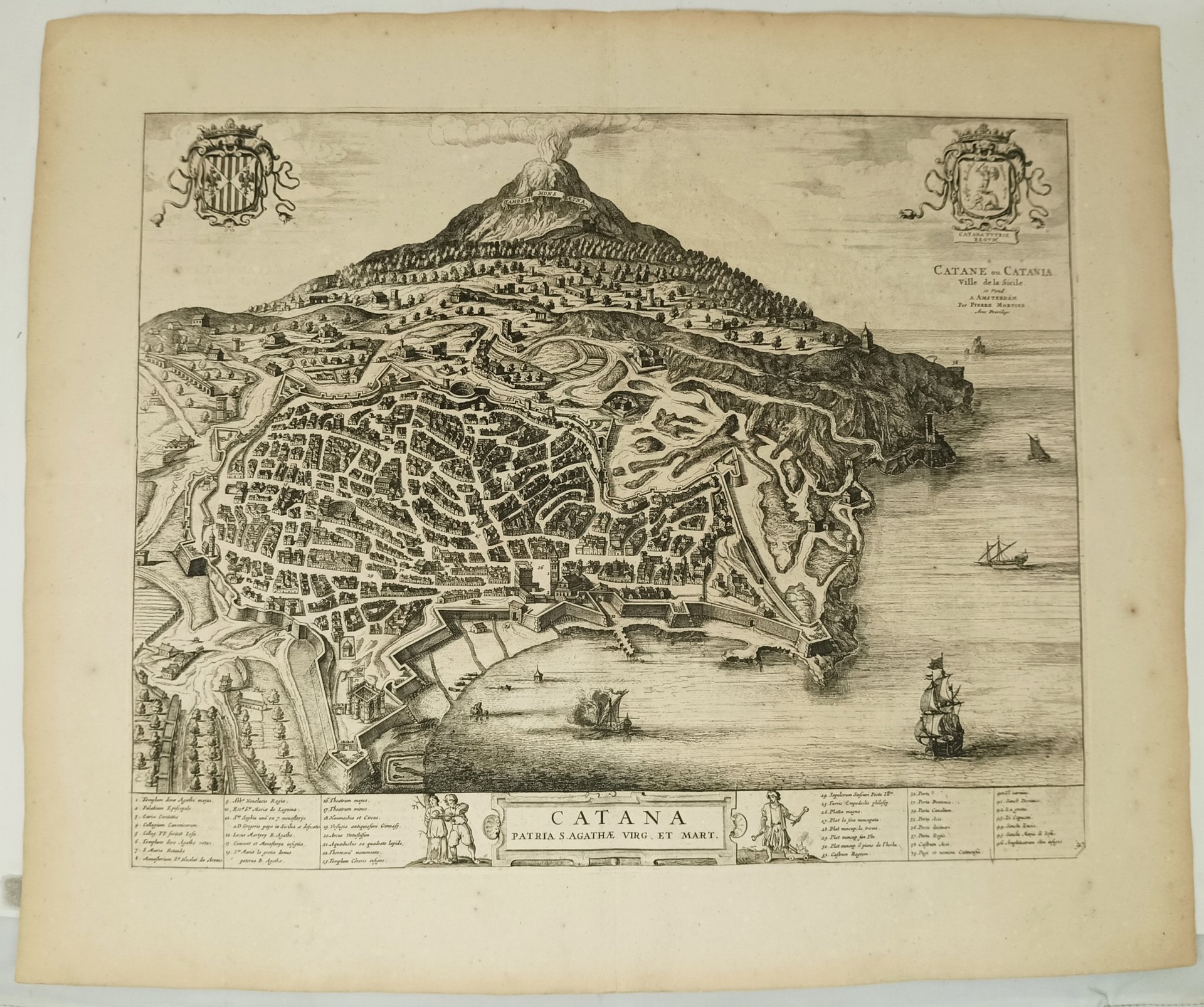 >Incisione originale su rame (mm. 420x530), ampi margini. Veduta a volo di uccello di Catania, tratta da “Nouveau Theatre d'Italie” edito ad Amsterdam da Pierre Mortier nel 1704/5. La lastra è quella usata da Joan Blaeu nel 1663. Il rame fa parte di quelli salvati dallo spaventoso incendio del 1672 ed acquistati all'asta da Pierre Mortier, il quale li integrò e riutilizzò per il suo Nouveau Theatre d'Italie. La veduta si riconosce rispetto a quella di Blaeu per la mancanza del testo al verso. Bellissima veduta a proiezione obliqua della città siciliana e del suo affaccio sul mare, porto animato da vascelli e velieri. Titolo entro cartiglio in basso, con raffigurazione del martirio di Sant'Agata e legenda lungo tutto il bordo inferiore con 46 rimandi di punti di interesse. In alto, a sinistra e destra, stemmi della Sicilia e della città di Catania. Bell'esemplare.