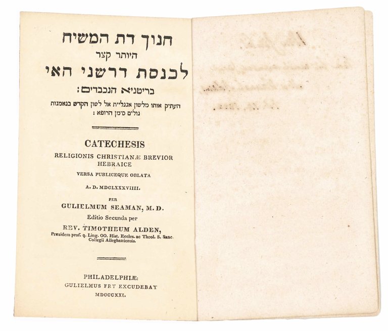 חנוך דת המשיח היותר קצר לכנסת דרשני האי בריטניא Catechesis religionis Christianae brevior Hebraice versa publiceque oblata A.D. MDCLXXXVIIII. Per Gulielmum Seaman, M.D. Editio secunda per Rev. Timotheum Alden, Praesidem prof. q. Ling. OO. Hist. Eccles. ac Theol. S. Sanc. Collegii Alleghaniensis | Libri antichi e moderni | SEAMAN, William (1606-1680)-ALDEN, Timothy (1771-1839) (signed