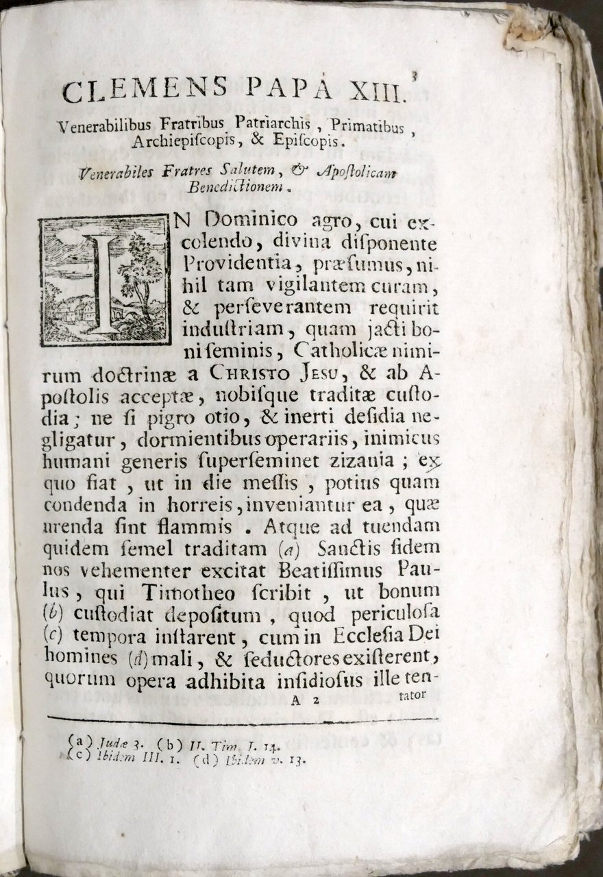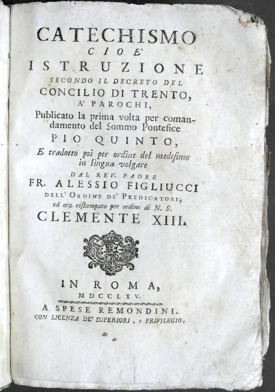 Catechismo cioè Istruzione secondo il Decreto del Concilio di Trento, a' parrochi, pubblicato la prima volta per comandamento del sommo pontefice Pio Quinto, e tradotto poi per ordine del medesimo in lingua volgare dal rev. padre fr. Alessio Figliucci dell'Ordine de' Predicatori, ed ora ristampato per ordine di N.S. Clemente XIII In Roma, a spese Remondini, 1765 Pag. 432 Legatura in cartonato non coeva - Testo in italiano Condizioni buone / discrete. Piccola mancanza all'angolo superiore delle prime 24 pagine. Segni di tarlo da pag. 418 alla fine del volume con lesione parziale del testo