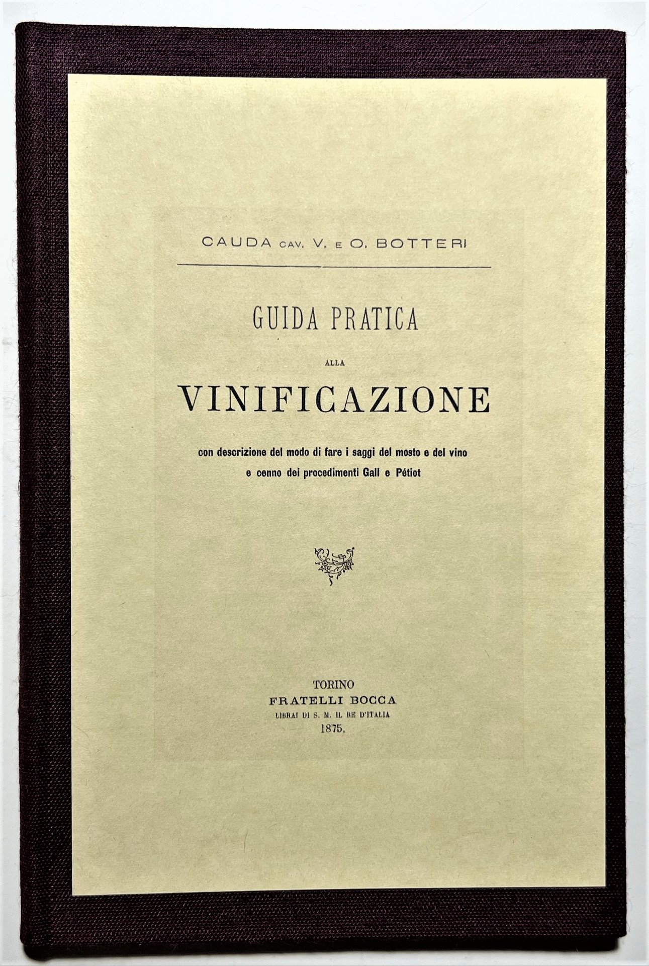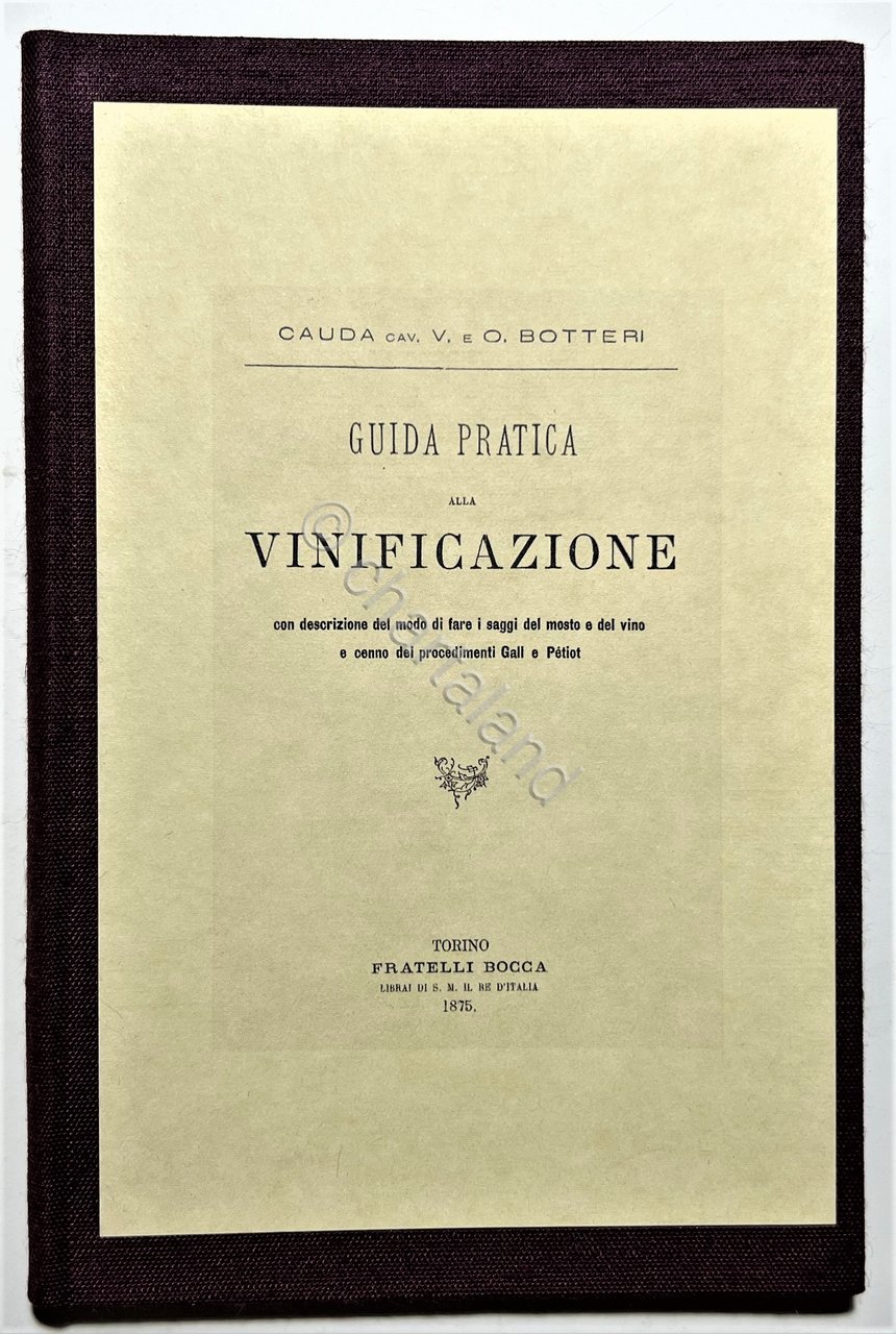 Cauda Cav. V. e O. Botteri - Guida Pratica alla Vinificazione - ed. 1875 Testo in lingua italiana. Pagine 68 con 1 tavola ripiegata. Copertina rigida. Condizioni molto buone con piccoli segni del tempo come da foto, legatura rifatta.