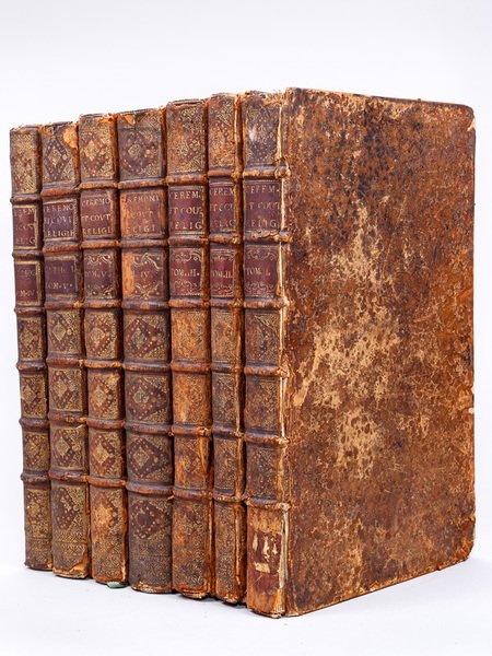 7 vol. in-folio (45,4 x 28,5 cm en marges) reliure de l'époque plein veau marbré, dos à 6 nerfs ornés (différence entre les fers des 3 premiers volumes et des 4 derniers), A Amsterdam, 1723-1737, Tome I (Juifs et Chrétiens catholiques), 1723 : 1 f. blanc, 6 ff., XLVII pp., 4 ff., 66 pp., 1 f., 153-206 pp., 1 f. 1 f. blanc, avec 35 planches hors texte ; Tome II (Catholiques), 1723 : 2 ff., 197-104 pp. avec 27 planches hors texte ; Tome III (Cérémonies des peuples des Indes Occidentales), 1723 : 2 ff., 211-150 pp., 1 f., 1 f. blanc, avec 45 planches hors texte ; Tome IV (Des Peuples Idolâtres), 1728 : 2 ff., 386-38-84 pp. et 1 f. n. ch., avec 58 planches hors texte ; Tome V (Cérémonies des Grecs et des Protestants), 1733 : 396 pp. avec 15 planches hors texte ; Tome VI (Anglicans, Quakers, Anabaptistes), 1736 : 2 ff., 13-348 pp. et 1 f. n. ch. (carton en sus : pp. 187-188), avec 14 planches hors texte ; Tome VII (Mahométans) : 2 ff., 291-32-160 pp. avec 26 planches hors texte (dont la dernière rehaussée en couleurs) Rare exemplaire sur grand papier, bien complet des 7 premiers tomes, bien complet des 224 planches hors texte, en édition originale (sauf pour le tome VI, daté de 1736, avec une planche supplémentaire par rapport à l'édition originale de 1735). Les deux volumes de supplément, qui furent publiées ultérieurement en 1743, ne sont pas présents. "La première édition est celle qu'on préfère, parce qu'elle contient les premières épreuves" (Cohen-Ricci, I, 134-135). Très richement illustré, cette compilation des écrits de Richard Simon, d'Abbadie, du P. Le Brun, de Boulainvilliers, etc. fut notamment rédigée par le libraire et éditeur Jean-Frédéric Bernard et par Bruzen de La Martinière. Etat très satisfaisant (différence entre les fers des 3 premiers volumes et des 4 derniers, forts accrocs en reliure avec mq. en dos et plats, qq. petites faiblesses mais reliures bien solide, qq. brunissures et petits défauts, mais bon état intérieur général).