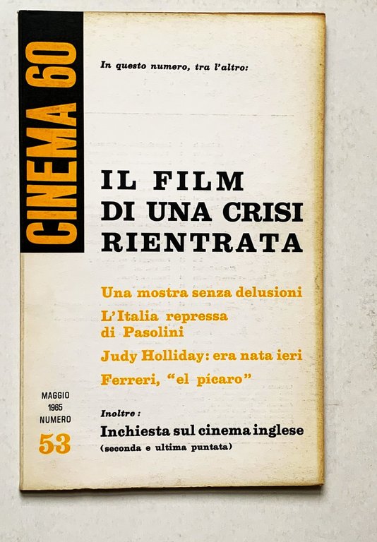 I ed., n. 53 - anno VI - maggio 1965 del mensile (Direzione, redazione, amministrazione: Roma, Via Colonna Antonina, 52). VIII/ 64/ brossura in cartoncino liscio bianco con grafica in n/giallo. Stato buono (copertina e pagine brunite). Indice: Editoriale: Legge sbagliata: compromesso conseguente - Cinema '60: Il film di una crisi rientrata - Umberto Rossi: L'incidenza americana sul mercato italiano - corsivo: I professorini di James Bond - Lorenzo Quaglietti: Una mostra senza delusioni - rubrica: Business show - Claudio Bertieri: Gli esordienti di Pesaro - Mino Argentieri: Sintesi e conclusioni di un dibattito - rubrica: Film in cantiere e in progettazione - corsivo: Naufraga la distribuzione italiana - Rita Porena: L'Italia repressa di Pasolini - corsivo: Spie e fumetti cinematografici - Silvère Lotringer: Nel cerchio della creazione - l. s.: Personaggi: J. von Sternberg - Claudio Bertieri: Era nata ieri - Giampiero Berengo Gardin: Ferreri "el pìcaro" - rubrica: Business show - rubrica: I lòettopri a "Cinema '60" - corsivo: I becchini frettolosi della "nouvelle vague" - Un'interessante inchiesta sul consumo cinematograficco in Francia - rubrica: L'occhio del critico - rubrica: Panoramica - rubrica: Notizie Lampo.