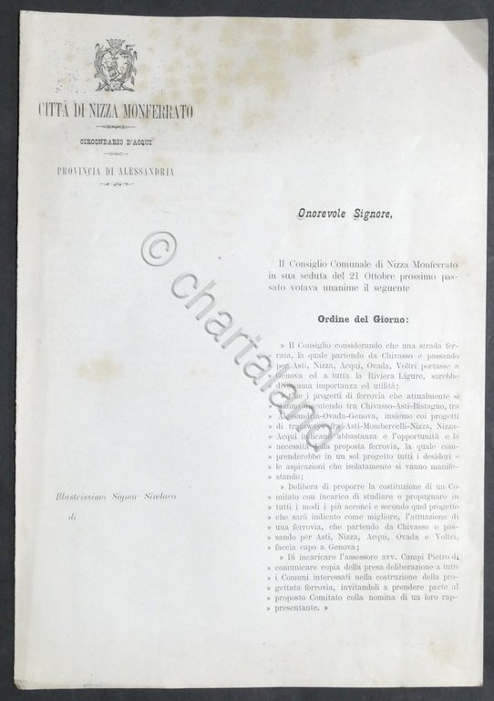 Città di Nizza Monferrato - Lettera su progetti di ferrovie in Piemonte - 1879