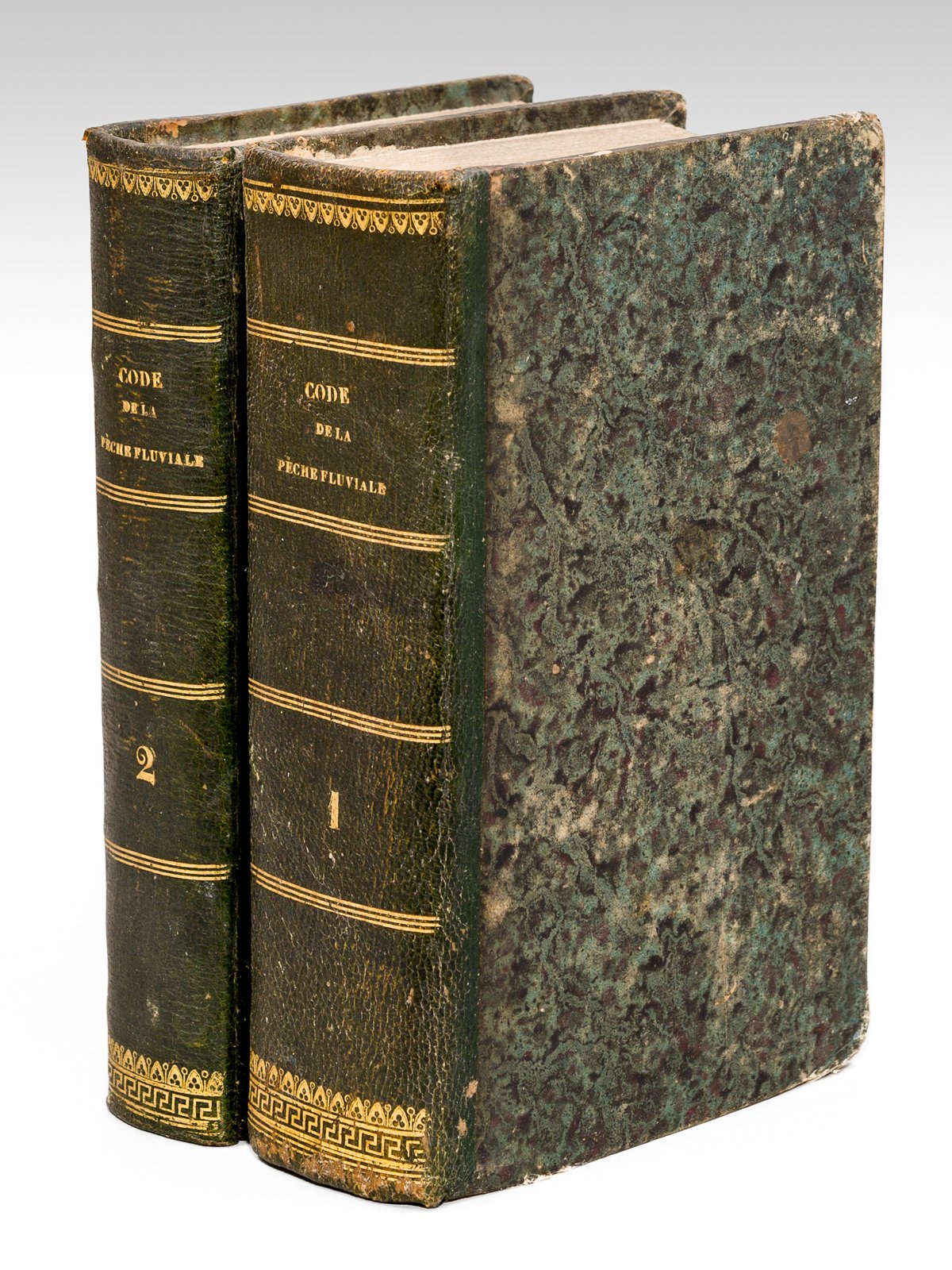 2 vol. fort in-12 reliure de l'époque demi-basane verte, Arthus Bertrand, Paris, 1829, XV-479 pp. ; 2 ff., 460-12 pp. et 23 planches. Rappel du titre complet : Code de la Pêche Fluviale, avec un Commentaire des articles de la Loi, les motifs de cette loi, la discussion aux deux chambres, des modèles de procès-verbaux pour délits de pêche, etc., suivi d'un Commentaire de la Pêche Fluviale, contenant l'Histoire naturelle des Poissons ; l'Explication des termes de Pêche et de Navigation ; la Description des Lignes, Hameçons, Filets, Instruments et Procédés employés dans les diverses sortes de Pêche ; l'analyse de l'ancienne et de la nouvelle Législation sur le Droit et l'Exercice de la Pêche dans les rivières navigables ou flottables, canaux, ruisseaux ou cours d'eau quelconque, etc. ; Ouvrage accompagné d'un Atlas composé de 23 planches gravées par Tardieu Rare exemplaire de l'édition originale du Code de la pêche fluviale, de l'agronome et forestier Jacques-Joseph Baudrillart (1774-1832) bien complet des 2 tomes et de l'atlas de 23 planches (dont essentiellement figures de mouches, d'hameçons et d'instruments de pêche). Promoteur de l'Ecole royale forestière, Baudrillart propose ici en complément à son Code forestier, une législation destinée à remplacer l'ordonnance de 1669 "et un grand nombre de réglemens qui n'étaient plus en harmonies avec nos institutions". Bon état pour cet exemplaire dont le premier tome a été intégralement interfolié pour la prise de notes (coupes et coins frottés, qq. rouss. et traces d'usage, bon exemplaire par ailleurs).
