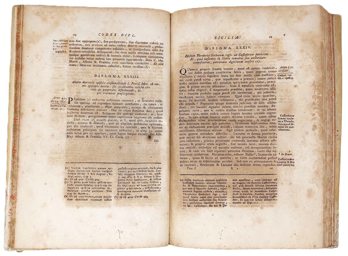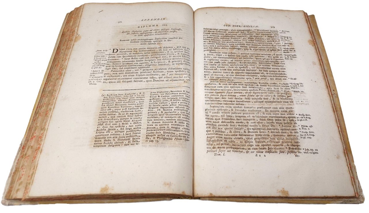 >in-folio, pp. XII, 500, (4), legatura coeva in pergamena rigida (con mancanze integrate agli spigoli infer.), tit. e fregi oro al dorso, tagli marmorizzati. Vignetta al titolo, testata con ritratto in ovale del segretario di stato di Benedetto XIV, cardinale Silvio Valenti Gonzaga, cui l'opera è dedicata, altra bella testata con fig. allegoriche all'inizio del testo, due grandi bellissime iniz. incise. Prima ed unica edizione di questo primo tomo (l'unico pubblicato dei cinque previsti), di straordinaria rarità. «Questo volume comprende 300 diplomi autentici e nell'appendice altri 29 dubbi o apocrifi (i primi due in caratteri greci, con traduzione latina a fronte) de' primi dieci secoli cristiani, e parecchie dissertazioni dell'autore sulla fondazione, polizia, disciplina delle Chiese sicole» (Narbone II, 41). Sottoposta a revisione, l'opera (il cui progetto era stato pubblicato già nel 1741) fu aspramente ed ingiustamente censurata dal Mongitore, il quale dopo aver affannosamente esaminato in una sola notte il volume stampato, morì di apoplessia il giorno seguente; e poiché una parte del popolo pretendeva che l'opera venisse messa al rogo, il Senato di Palermo ordinò che il primo volume, già stampato, fosse soppresso e che tutte le copie fossero consegnate all'Arcivescovo. Niente più si seppe degli altri volumi manoscritti. Successivamente, però, lo stesso Senato fece riesaminare il volume e ne permise la pubblicazione, facendovi inserire in fine la ''auctoris admonitio ad lectorem'', cioè un avvertimento contenente varie correzioni, una specie di ''errata corrige'' di presunti errori sostanziali. E' sicuramente la più importante e la più bella tra le molte opere del dottissimo autore (Taormina 1699 - Palermo 1753), letterato, giurista, canonico della cattedrale di Palermo, Vicario capitolare ed infine giudice della Reggia di Sicilia. Esemplare genuino, a grandi margini ,con bruniture della carta, in rari casi anche piuttosto marcate, ma che non inficiano la godiibilità del volume, lavoro di tarlo nel margine superiore destro delle pagine 268-298 . Mira I, 431.