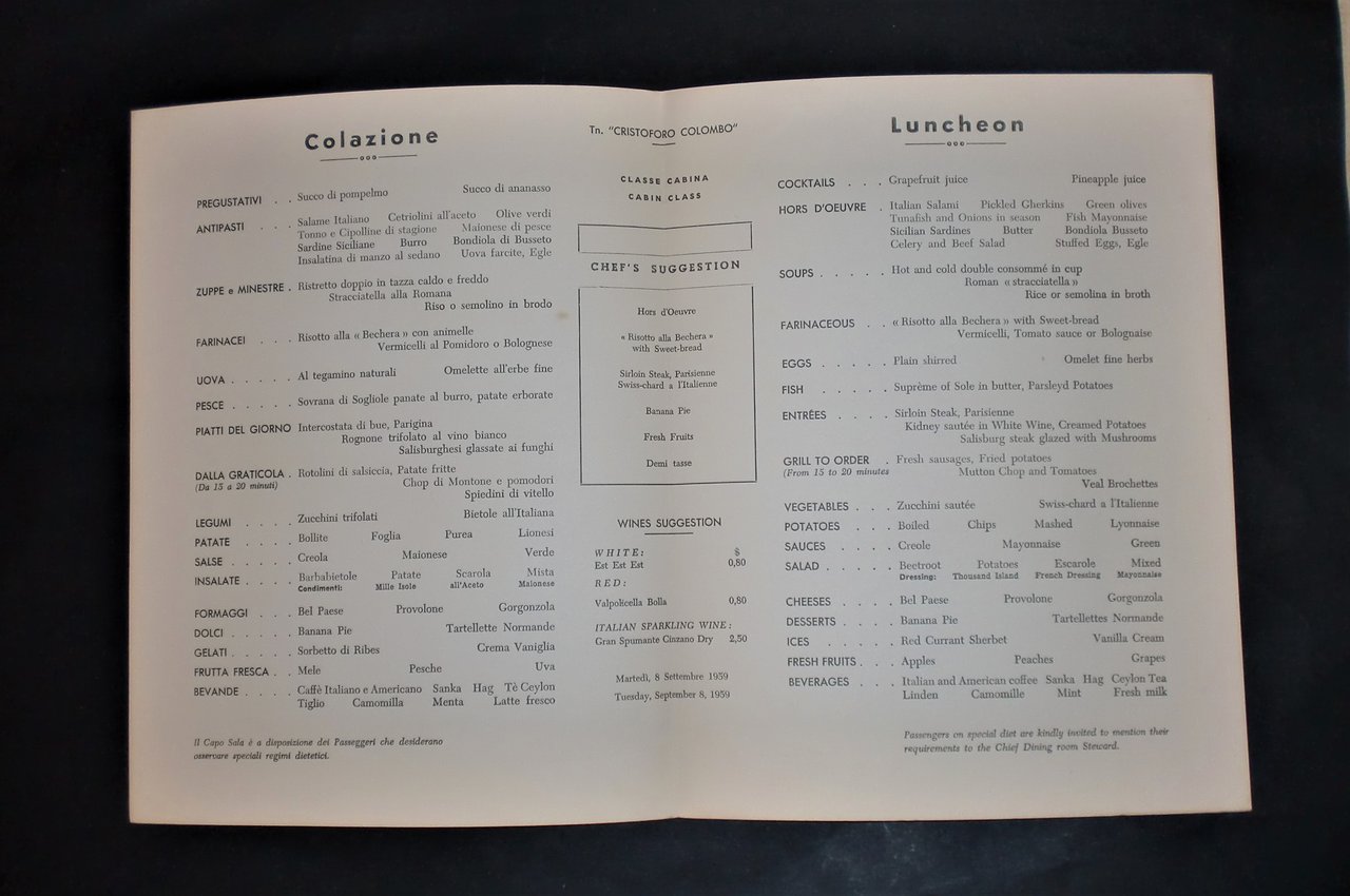 Collezionismo menù Tn. Cristoforo Colombo Colazione, cabin class Martedì, 8 settembre 1959