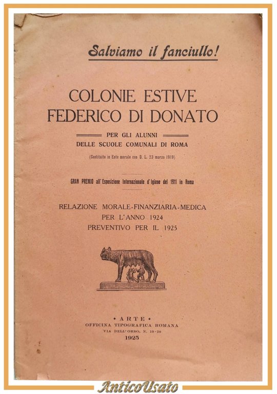 COLONIE ESTIVE "FEDERICO DI DONATO". Per gli alunni della Scuole Comunali di Roma. Relazione morale-finanziaria-medica per l'anno 1924, preventivo per il 1925.
