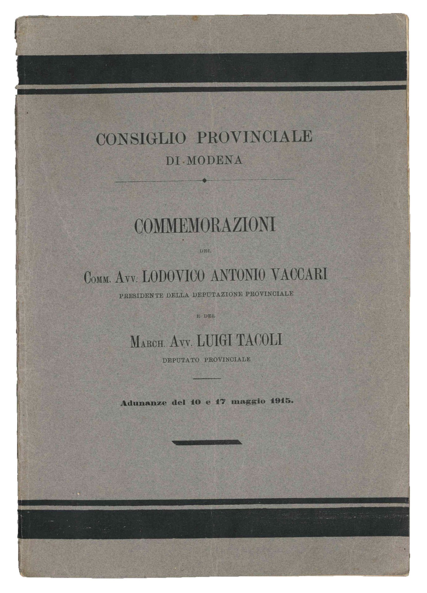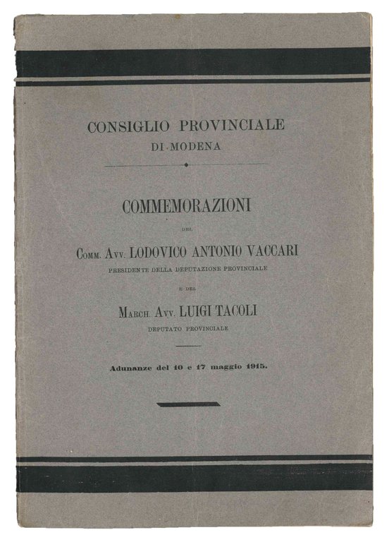 Commemorazioni del comm. avv. Lodovico Antonio Vaccari, Presidente della Deputazione provinciale, e del march. avv. Luigi Tacoli, deputato provinciale. | Libri antichi e moderni | COMMEMORAZIONI DELL''AVVOCATO VACCARI