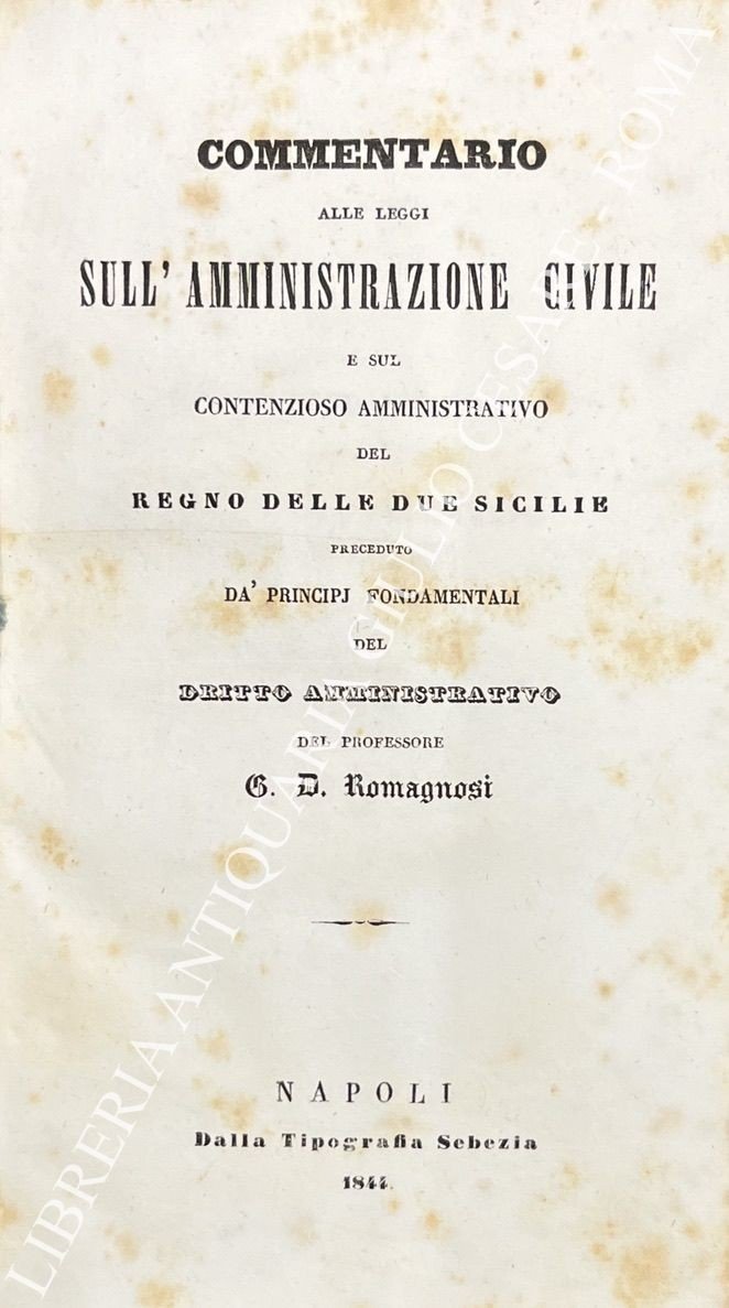 Commentario alle leggi sull'amministrazione civile e sul contenzioso amministrativo del Regno delle Due Sicilie preceduto da principj fondamentali del dritto amministrativo | Libri antichi e moderni | Romagnosi Gian Domenico (1761-1835)