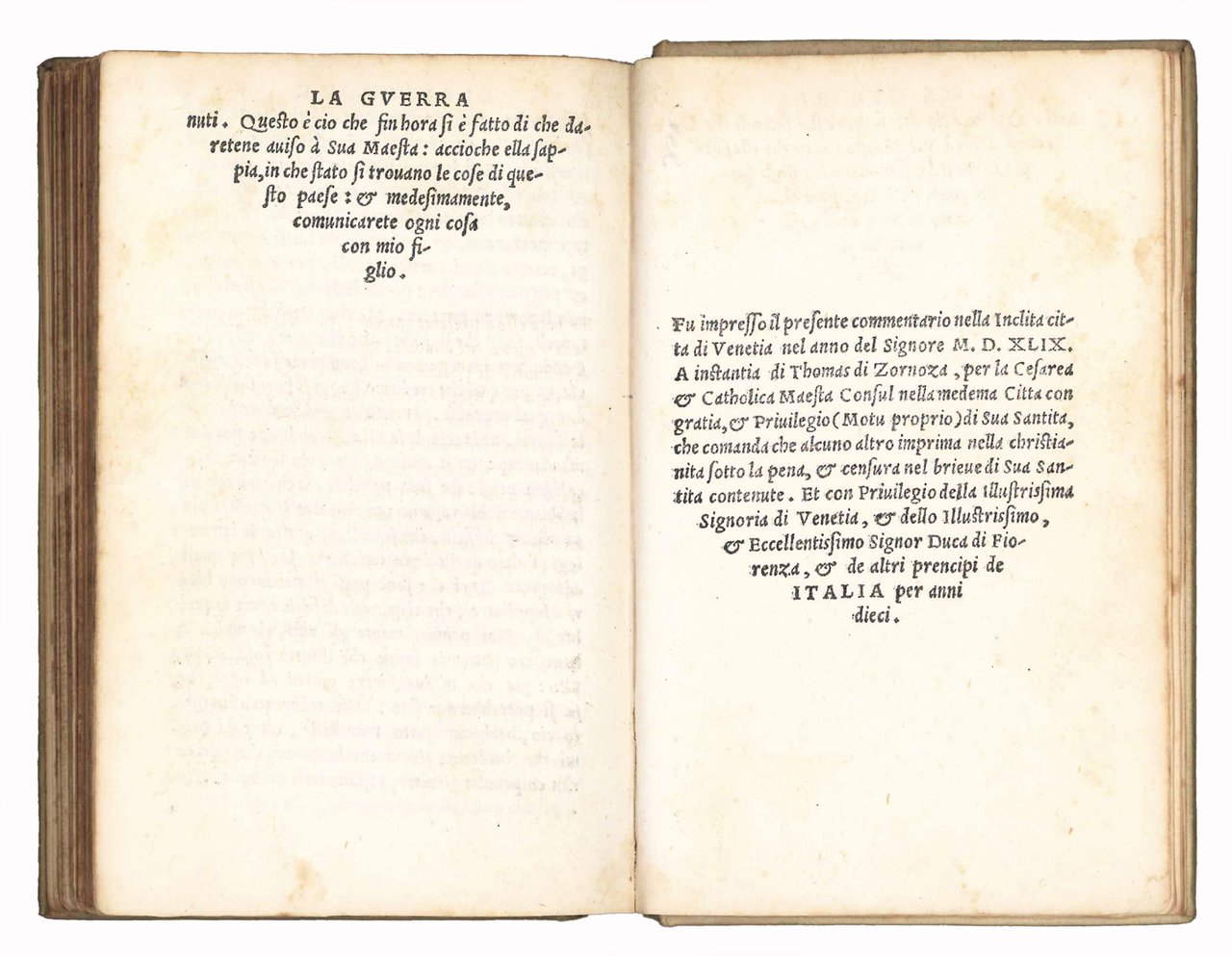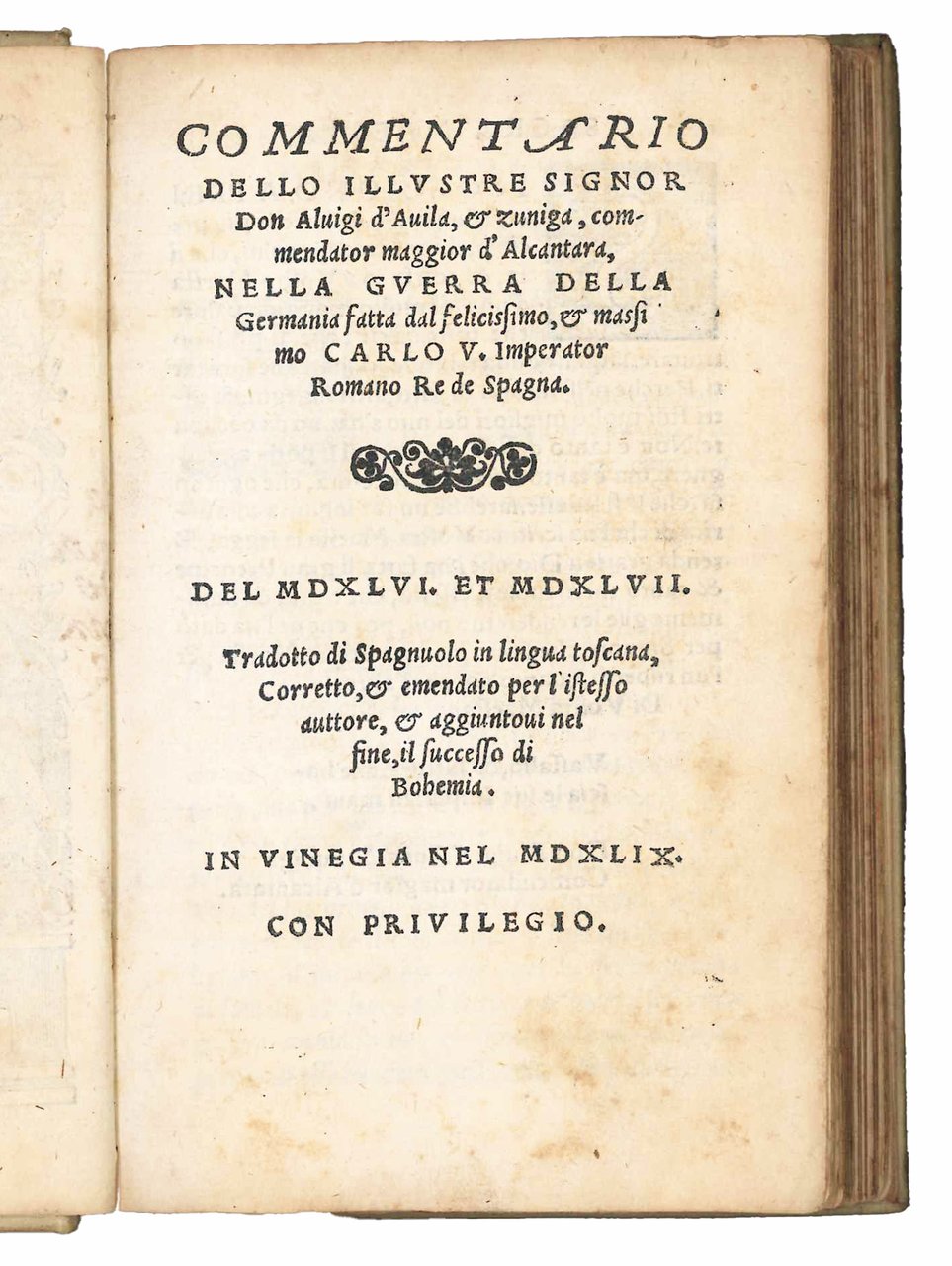 Commentario dello illustre Signor don Alvigi d'Avila, et Zuniga, commendator maggior d'Alcantara, nella guerra della Germania fatta dal felicissimo, et massimo Carlo V Imperator Romano re de Spagna del MDXLVI et MDXLVII. Tradotto di spagnuolo in lingua toscana, Corretto, et emendato per l'istesso auttore, et aggiuntovi nel fine, il successo di Bohemia. In Vinegia nel MDXLIX | Libri antichi e moderni | AVILA Y ZÚÑIGA, Luis de (1504-1573)