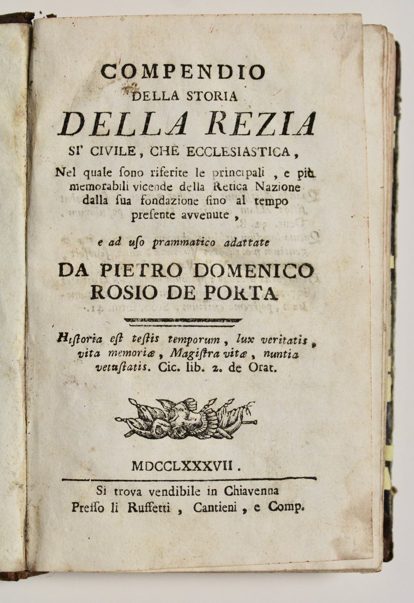 In 8°(mm 175x110); pagg. XVI, CCCXL. Fregi ed iniziali silografiche.Mezza pelle coeva con piccoli angoli, piatti marmorizzati, dorso muto con nervetti. Prima edizione di questa assai rara descrizione storica compendiata dei Grigioni, con ampie notizie relative alla Valtellina. Alla fine vi è un'appendice con l'intera successione dei prefetti della repubblica delle Tre Leghe.Buon esemplare che presenta un alone al margine interno da pag. CL fino alla fine, inizialmente molto piccolo, più esteso alla fine. Lievi tracce d'uso alla legatura.