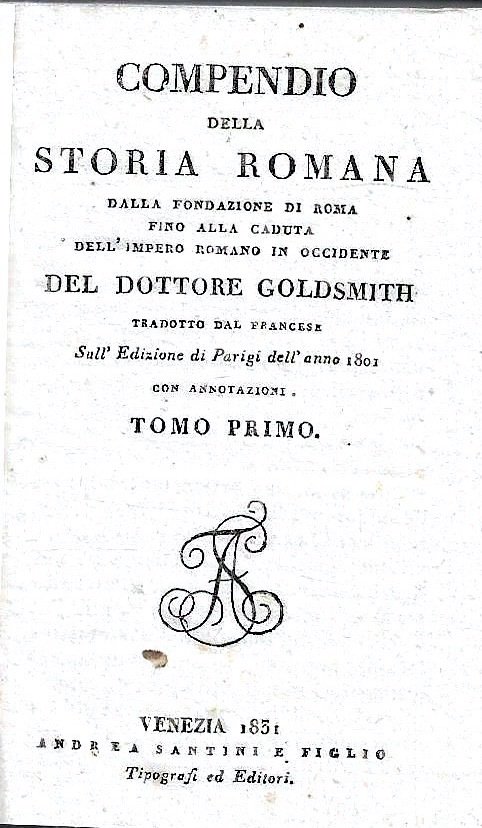 Compendio della storia romana dalla fondazione di Roma fino alla caduta dell'Impero Romano in Occidente del Dottor Goldsmith, tradotto dal francese sull'Edizione di Parigi dell'anno 1801 con annotazioni. Tomo Primo