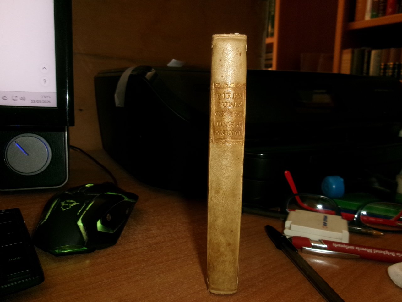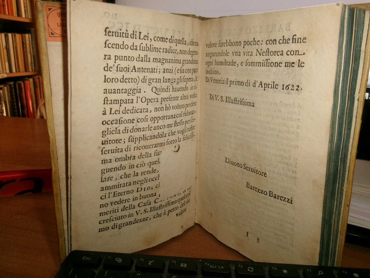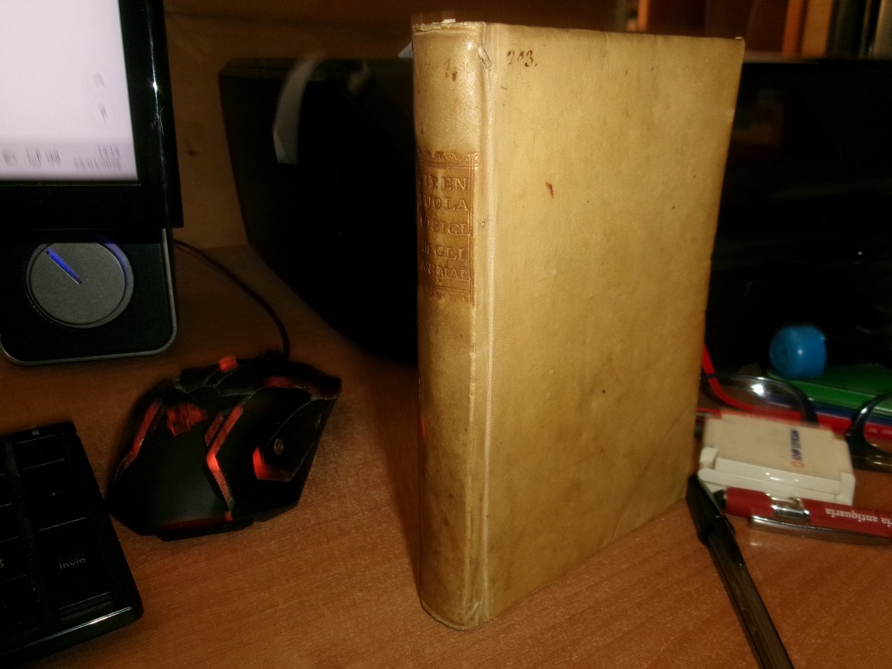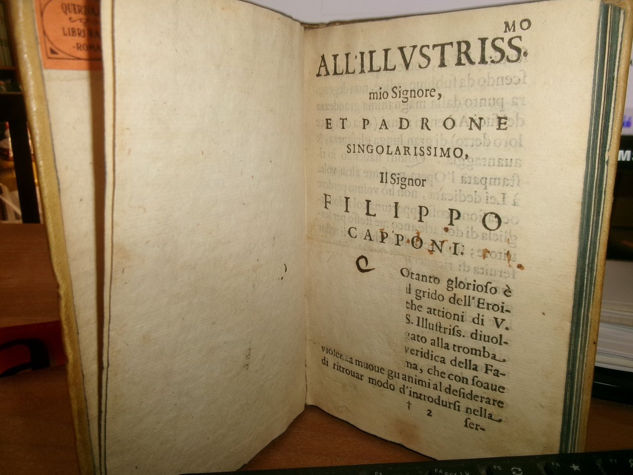 FIRENZUOLA, Agnolo. Consigli degli animali cioè Ragionamenti civili... Aggiuntovi un Discorso do Ieronimo Capugnano, ove prova che gli animali ragionano insieme. - - Discorso sopra tutti li parlari che si fanno in cielo...nel centro della Terra... e dell' inferno... scritto... da F. Ieronimo Giovannini...- - Dilettevoli orationi nella morte di diversi animali... Venetia, Barezzo Barezzi, 1622. In-8° antico, pergamena coeva. (16), 80 pp.; 110, (10) pp.; 64, (8) pp. Esemplare col frontespizio foderato, un restauro alla seconda carta con asportazione di testo e un piccolo strappo all' angolo superiore delle pp. 75-80; piccola tarlatura marginale nella seconda parte; peraltro ben conservato.Neg. Mob. 7