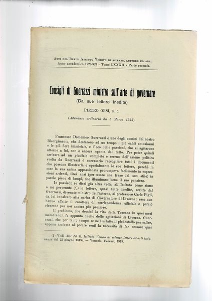 Consigli di Guerrazzi sull'arte di governare (da sue lettere inedite). Estratto dagli Atti del Reale Istituto Veneto di scienze lettere e arti del 1922-1923. | Libri antichi e moderni | Orsi Pietro.