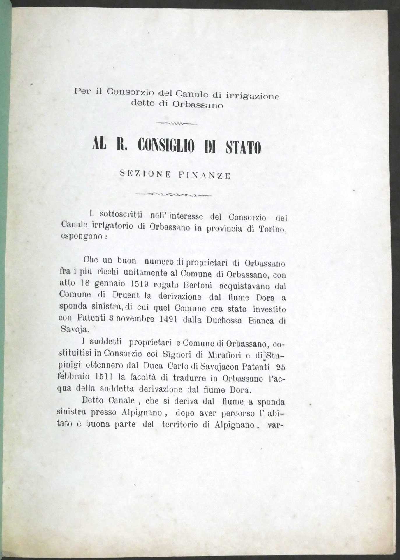 Consorzio Canale di Orbassano - Esposizione al R. Consiglio di Stato - 1885