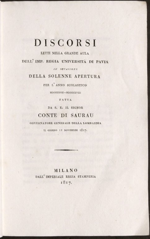 Conte di Saurau - Discorsi di apertura anno scolastico Università Pavia - 1817 | Libri antichi e moderni |
