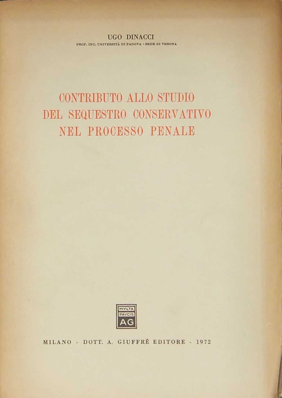 Contributo allo studio del sequestro conservativo nel processo penale | Libri antichi e moderni | Dinacci Ugo