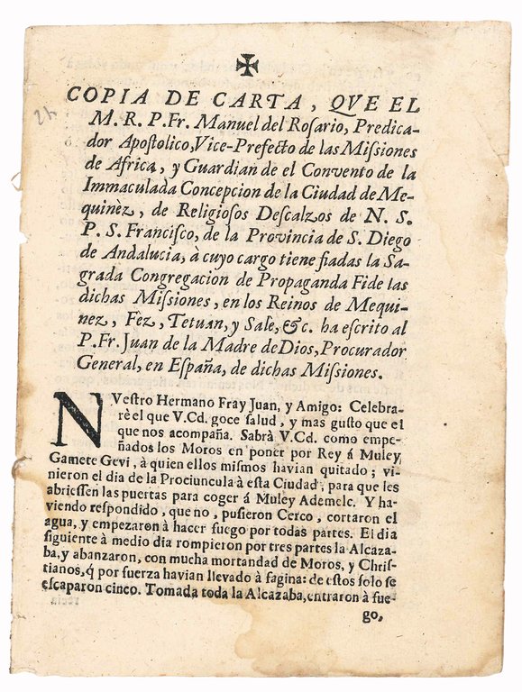 Copia de carta, que el M.R.P. Fr. Manuel del Rosario, Predicador Apostolico, Vice-Prefecto de las Missiones de Africa, y Guardian de el Convento de la Inmaculada Concepcion de la Ciudad de Mequinèz, de Religiosos Descalzos de N.S. P.S. Francisco, de la Provincia de S. Diego de Andalucia, à cuyo cargo tiene fiadas la Sagrada Congregacion de Propaganda Fide las dichas Missiones, en los Reinos de Mequinez, Fez, Tetuan, y Sale, &c., ha escrito al P. Fr. Juan de la Madre de Dios, Procurador General, en España, de dichas Missiones | Libri antichi e moderni | MANUEL DEL ROSARIO, O.F.M. (fl. early 18th cent.)