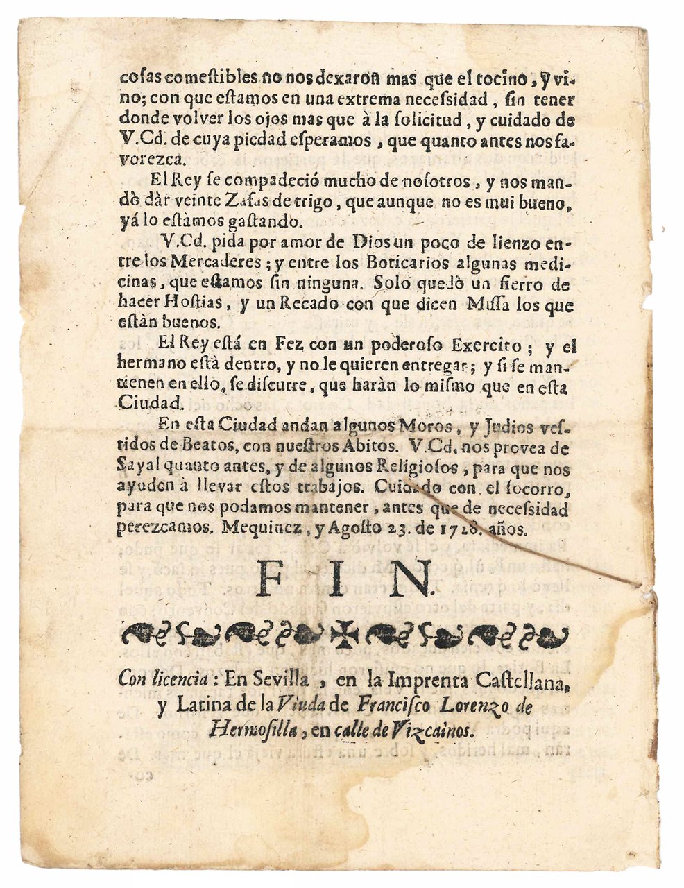 Copia de carta, que el M.R.P. Fr. Manuel del Rosario, Predicador Apostolico, Vice-Prefecto de las Missiones de Africa, y Guardian de el Convento de la Inmaculada Concepcion de la Ciudad de Mequinèz, de Religiosos Descalzos de N.S. P.S. Francisco, de la Provincia de S. Diego de Andalucia, à cuyo cargo tiene fiadas la Sagrada Congregacion de Propaganda Fide las dichas Missiones, en los Reinos de Mequinez, Fez, Tetuan, y Sale, &c., ha escrito al P. Fr. Juan de la Madre de Dios, Procurador General, en España, de dichas Missiones