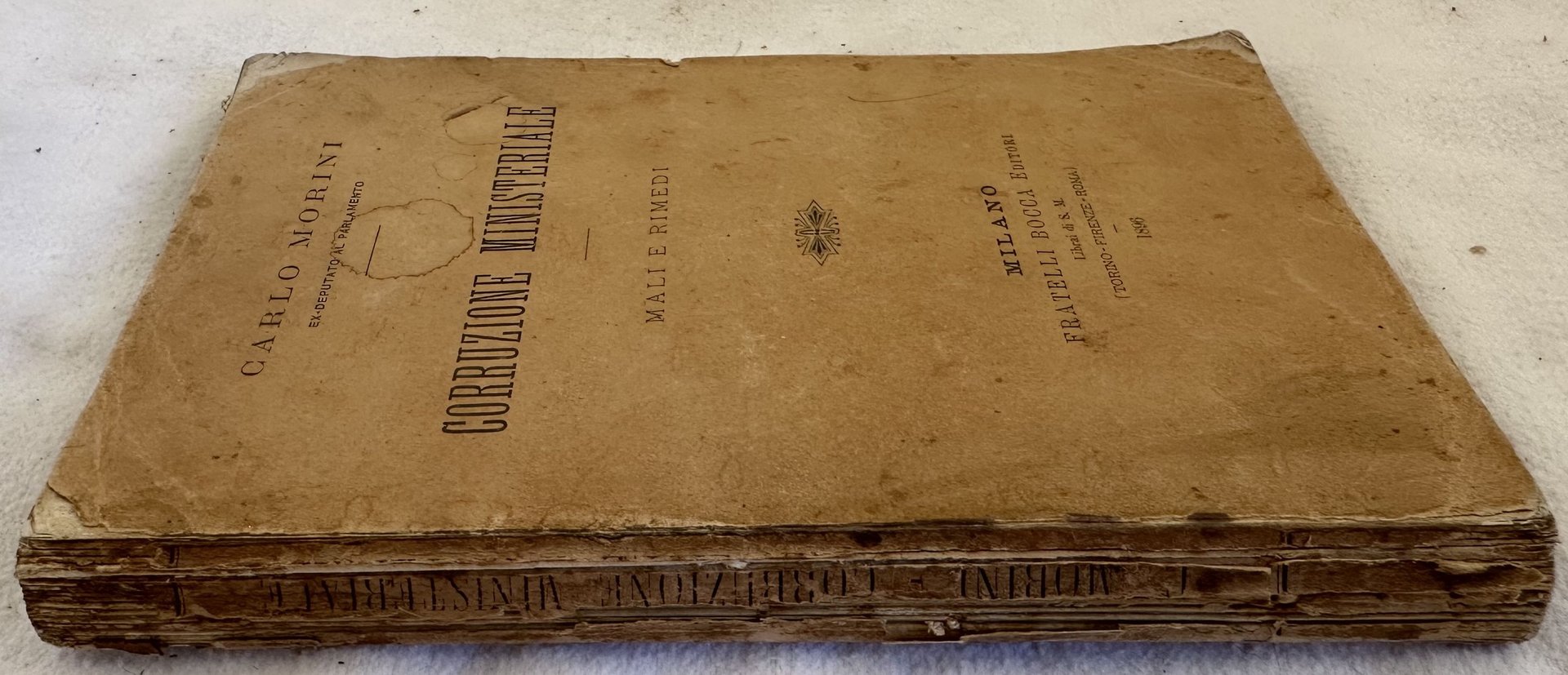 Interessante monografia del 1896 sulla corruzione ministeriale a cura di Carlo Morini, ex deputato del Regno. All'interno: Genesi e specie della corruzione politica; Inique arti di governo; Scuola dell'immoralità politica; Storia del Risorgimento italiano falsata; Calcari i buoni e sollevati i pravi; Alterata missione del principato; Popolo ingannato; Bugiarda prosperità economica; Fastosa politica interna ed esterna; Stampa periodica compra; Rimedi ai mali; Ministero savio forte e omogeneo; Ministri adatti ai loro dicasteri; Camera pura; Senato sapiente e vigoroso; Amministrazione rispondente alle forze della nazione. Segni manoscritti a matita colorata. In discrete condizioni ma completo. Coperta editoriale in mediocri condizioni generali con usure ai margini e dorso. Legatura in discrete condizioni con rotture. All'interno le pagine si presentano in buone condizioni con rare fioriture. In 16. Dim. 18,5x12,5 cm. Pp. VIII+261+(3).Interesting monography of 1896 about Ministero corruption by Carlo Morini, former deputee of the Reign. Inside: Genesi e specie della corruzione politica; Inique arti di governo; Scuola dell'immoralità politica; Storia del Risorgimento italiano falsata; Calcari i buoni e sollevati i pravi; Alterata missione del principato; Popolo ingannato; Bugiarda prosperità economica; Fastosa politica interna ed esterna; Stampa periodica compra; Rimedi ai mali; Ministero savio forte e omogeneo; Ministri adatti ai loro dicasteri; Camera pura; Senato sapiente e vigoroso; Amministrazione rispondente alle forze della nazione. Handwritten notes with coloured pencil. In fair conditions, but complete. Editorial cover in poor general conditions lightly worn in the extremities. Binding in fair conditions with cracks. Pages are in good conditions with occasional foxing. In 16. Dim. 18,5x12,5 cm. Pp. VIII+261+(3).