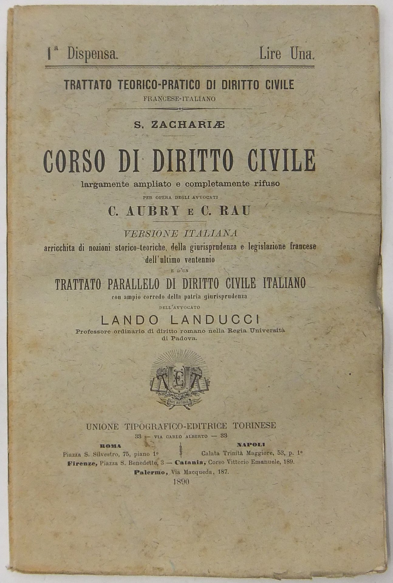 Corso di diritto civile largamente ampliato e completamente rifuso per opera degli avvocati C.Aubry e C.Rau. Versione italiana arricchita di nozioni storico-teoretiche della giurisprudenza e legislazione francese dell'ultimo ventennio ne d'un trattato parallelo di diritto civile italiano con ampio corredo della patria giurisprudenza dell'avvocato Lando Landucci | Libri antichi e moderni | Zacharia Von Lingenthal Karl Salomon (1769-1843) - Zachariae