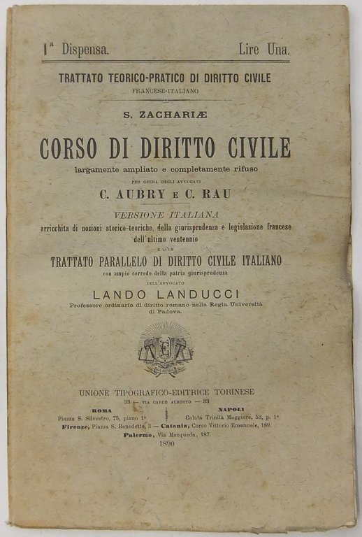 Corso di diritto civile largamente ampliato e completamente rifuso per opera degli avvocati C.Aubry e C.Rau. Versione italiana arricchita di nozioni storico-teoretiche della giurisprudenza e legislazione francese dell'ultimo ventennio ne d'un trattato parallelo di diritto civile italiano con ampio corredo della patria giurisprudenza dell'avvocato Lando Landucci