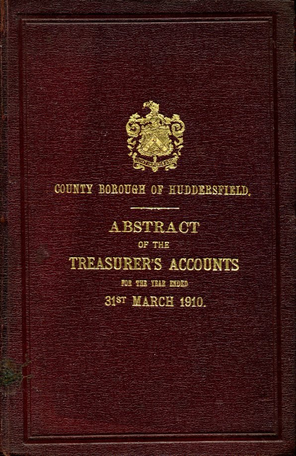 No marks or inscriptions to contents. No creasing to covers or to spine. A very clean very tight copy with slightly marked boards and a little rubbing to spine ends. Faint uneven fading to front. Clear gilt lettering to front and spine. Two large fold-out tables in excellent condition. 31 + 221pp. Abstract of the Treasurer's Accounts for the year ending 31st March 1910 for the Borough of Huddersfield in West Yorkshire, comprising the Borough Fund, Private Works Fund, Mayor's Fund, Police Pensions Fund, Cemetery Funds, Markets Fund, Tramways Fund, Electricity Fund, Waterworks Fund, Gas Works Fund, Library & Art Gallery Fund, Technical College Fund, Education Fund. Stocks and Loans Funds and the Sinking Fund (!). The final thirty-one pages are an estimate of the expected charges for the following year. Extremely scarce.