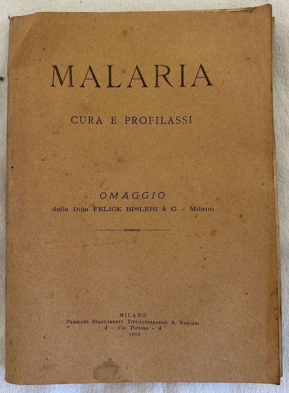 CURA E PROFILASSI DELLA MALARIA (ESPERIMENTI DI CURA E PROFILASSI - STUDI CLINICI - CONTRIBUTI CRITICI E DI CASISTICA) OMAGGIO DELLA DITTA FELICE BISLERI & C. - MILANO