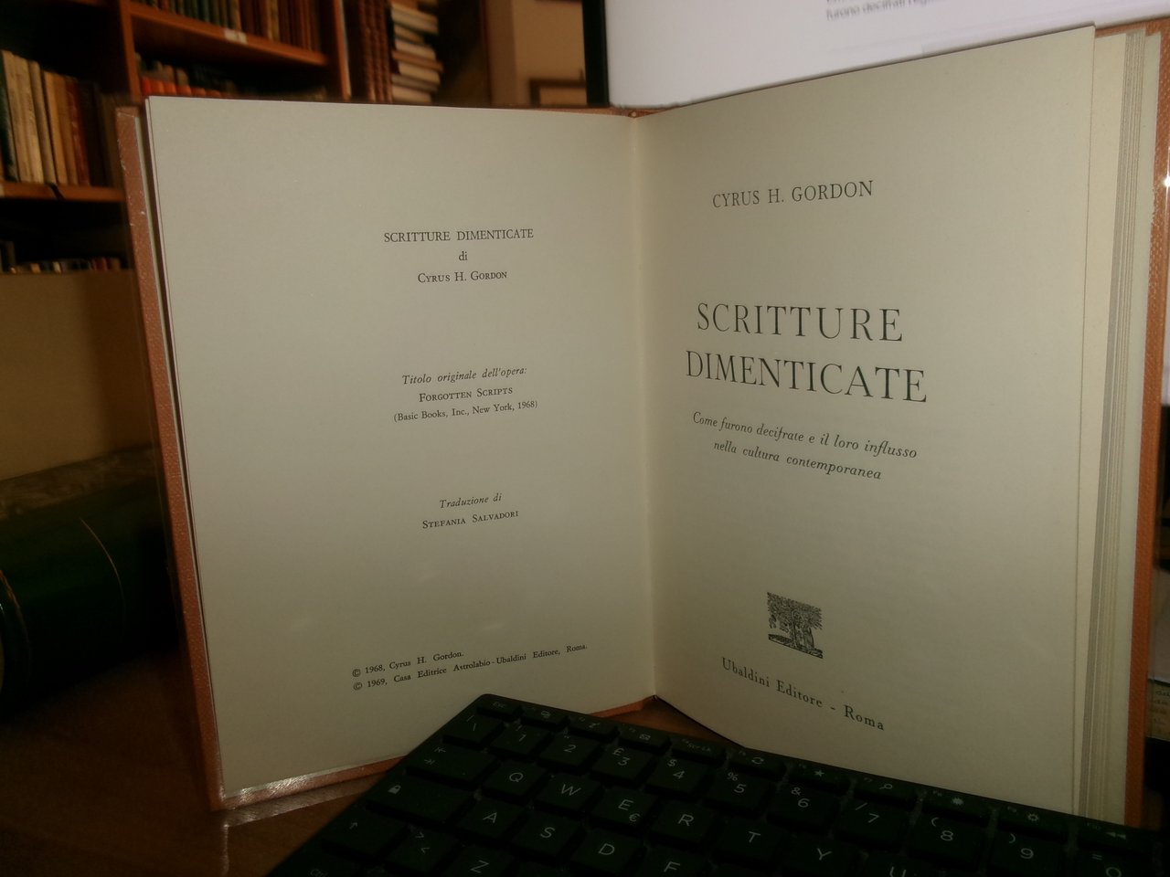 CYRUS H. GORDON. Scritture dimenticate. Come furono decifrate e il loro influsso nella cultura contemporanea. Roma, Ubaldini Editore, 1969. In-8°, tela edit. con sovracopertina in acetato. 176 pp. con numerose figure in nero n.t. Come nuovo. Neg. esot. mob. 100