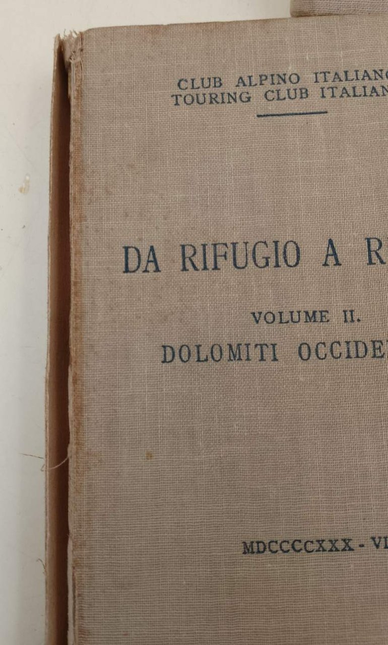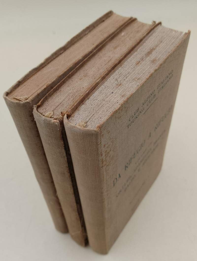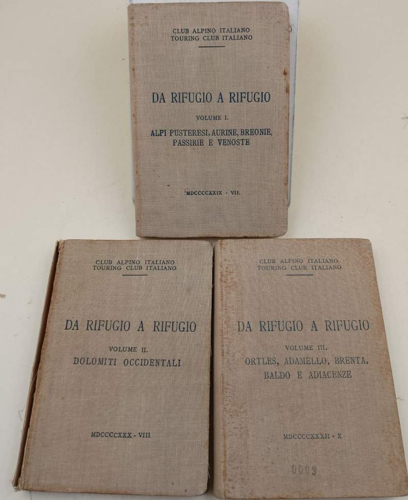 3 voll. in 16^, tela ed., vol. I Alpi Pusteresi, Aurine, Breonie, Passirie e Venoste, pp. 200, con 2 carte, 12 schizzi e 48 fotografie; segni del tempo, pagine ingiallite, tagli bruniti, minimi strappetti. Vol. II Dolomiti occidentali, pp. 249, con 1 carta, 12 schizzi e 72 fotografie; costa scollata, pagine ingiallite, tagli bruniti. Vol. III Ortles, Adamello, Brenta, Baldo e adiacenze, pp. 291, con 2 carte, 12 schizzi e 80 fotografie, fior., pagine ingiallite, segni del tempo. ***Due to bureaucratic reasons, books dated over 70 years old cannot be immediately exported, please contact us before placing the order.***