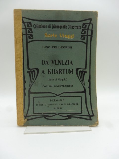 In 8 (cm 18,5 x 26), pp. 169 + (3) con riproduzioni fotografiche in bianco/nero intercalate al testo. Cartonatura editoriale con rinforzo al dorso. Fioriture alla pagina con l'occhietto e all'antecedente bianca. Edizione originale di questo racconto di viaggio da Venezia all'Egitto e al Sudan.