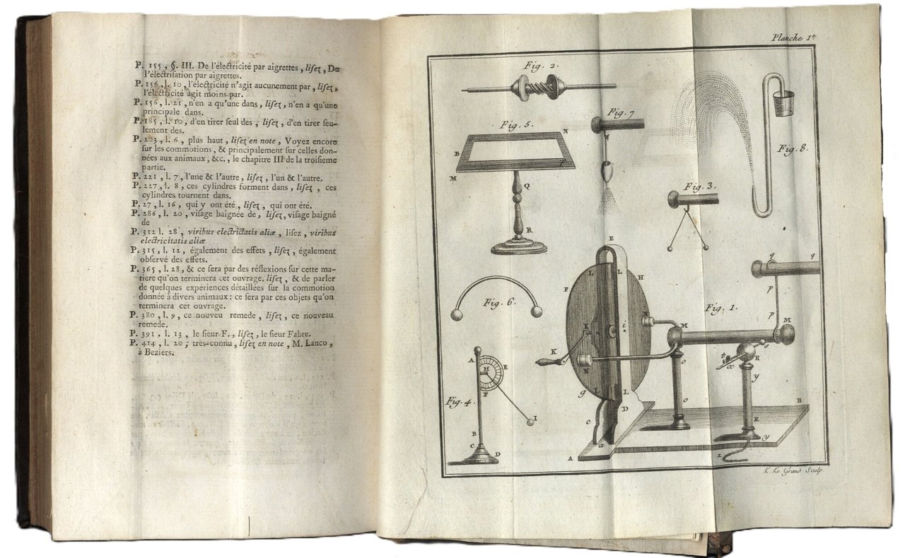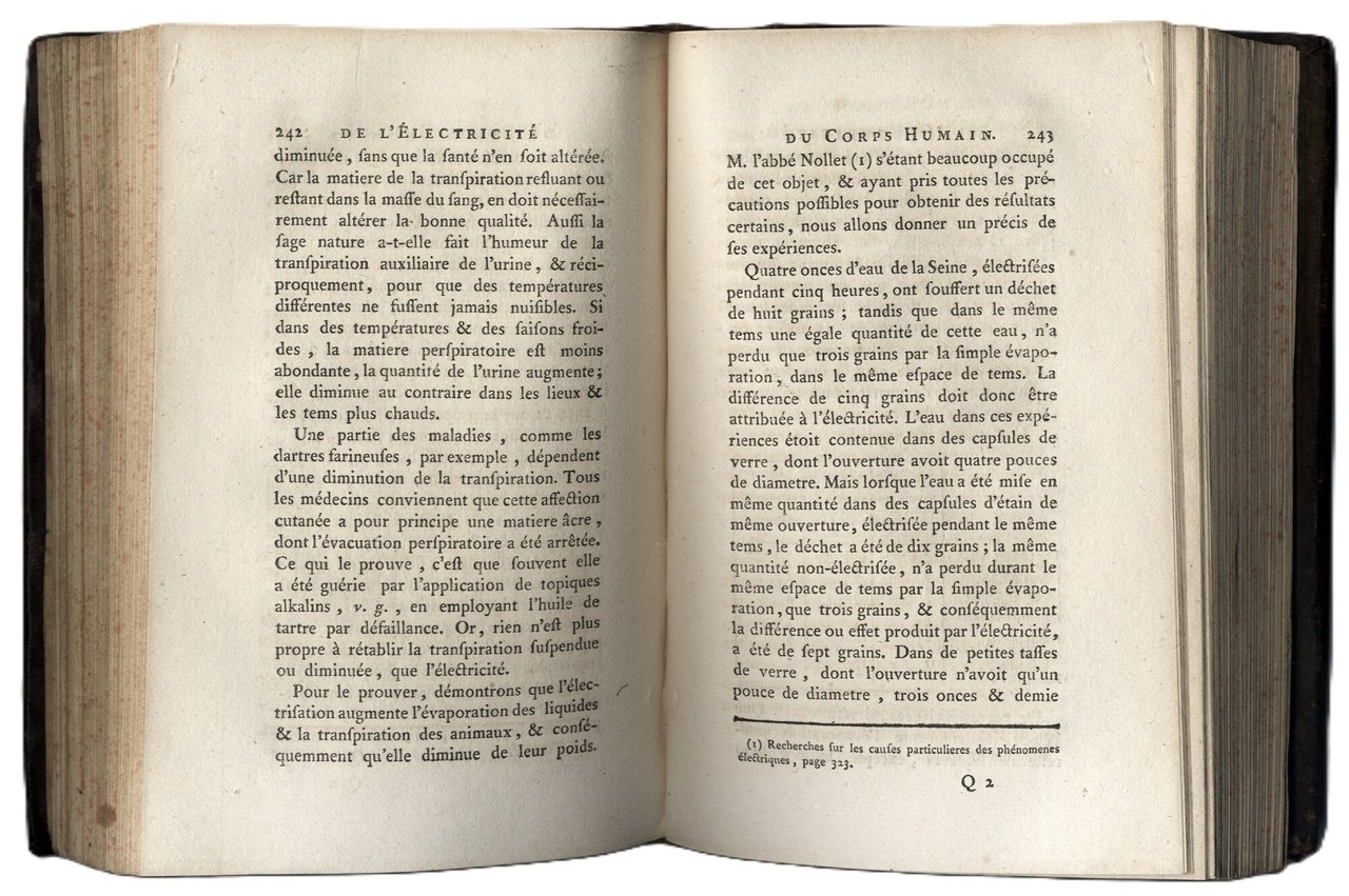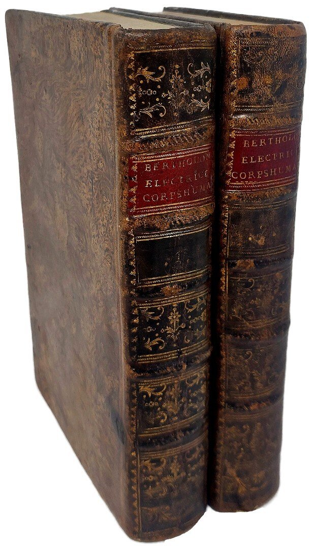 >2 vol. in-8 (190x120 mm), pp. (6), XXXIV, II, 522, (2); (4), IV, 510, (2); leg. del tempo p. pelle marmorizz., dorsi a nervi con tit. e fregi oro. Con 6 tav. inc. in rame ripieg. f.t. raffig. strumenti ed applicazioni pratiche. Seconda edizione (la prima era apparsa nel 1780) di quest'importante trattato medico-scientifico sugli effetti dell'elettricità sul corpo umano, sulle malattie che può causare e sulle benefiche applicazioni per curarle, ecc. L'abate Bertholon (Lyon 1742-1800) fu medico e fisico, attento studioso dei fenomeni elettrici e dell'impiego dell'elettricità nella cura di molte malattie, grande amico di Benjamin Franklin. Ottimo esemplare. Wheeler Gift n. 533. Wellcome Cat. II, 154.