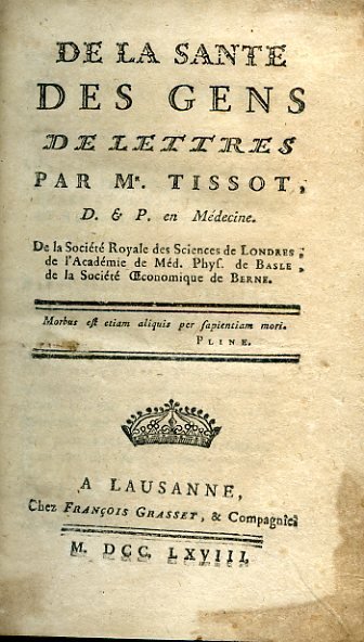 In-12° (163x100mm), pp. XII, 204, legatura coeva m pelle e angoli con filetti in oro e titolo in oro su tassello al dorso. Piatti marmorizzati. Ex-libris antico di Giovanni Francesco Bertalazone. Restauri alle cerniere. Alcune bruniture marginali di poco conto. Bell'esemplare. Prima traduzione francese, nonché prima edizione autorizzata, della dissertazione latina 'De valetudine litteratorum' (Losanna, 1766), relativa alle malattie cui sono soggetti gli uomini di lettere e gli individui sedentari; vi sono contenute anche numerose indicazioni sull'alimentazione e la dietetica. Il Tissot (Grancy, 1728-Losanna, 1797) fu tra i medici più celebri del suo tempo, geniale terapeuta, tra i primi efficaci divulgatori di materia medica e tra gli introduttori delle vaccinazioni contro il vaiolo, autore di una celebre e innumerevoli volte ristampata dissertazione sull'onanismo che parve all'epoca di straordinaria audacia. Blake, 452. Cushing, 122. Haeser, II, 616. Garrison, 367. Waller, 9610. Osler, 4110. Cat. Bibl. France, CXC, 106. DESM, XCVI, 611. DHBS, VI, 618. Montet, D.B.M., II, 566-568. Heirs of Hippocrates, 979. Cfr. Guisan-Olivier, 'Le docteur Tissot', Losanna, 1928; Hirsch, V, 688; Olivier, Médecine et Santé dans le Pays de Vaud au XVIIIe siècle, II, 1060-1062; Barras, La Médecine des Lumières tout autour de Tissot, 2001, passim.