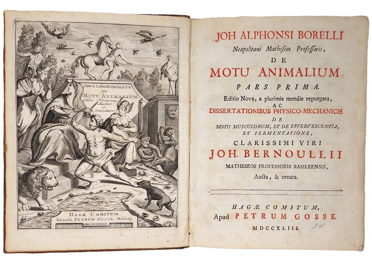 >2 volumi in-4, pp. (10), 228, (18); (4), 290, (14), 45 (aggiunte di Bernoulli); leg. del tempo p. pelle marmorizz., dorsi a nervi con tit. e filetti oro (antichi restauri ai dorsi). Corredati di antiporta allegorica e 19 tavole finem. inc. in rame ripieg. f.t. Stimata edizione (la prima era apparsa a Roma nel 1680-81) di questo famoso trattato nel quale i principii della meccanica vengono applicati per la prima volta agli animali; punto di partenza dell'innovativa teoria è la meccanica di Galileo. La prima parte presenta l'analisi della struttura scheletrica come sistema di leve (tav. I-X, vol. I), del moto nei vari mezzi ambientali (corsa, nuoto, volo) e dei meccanismi della contrazione muscolare. B. si discosta dal meccanicismo di Cartesio, attribuendo la contrazione muscolare ad una combinazione chimica istantanea tra fluido nervoso e sangue. Parlando del volo, l'A. fornisce la prima dimostrazione dell'impossibilità del volo muscolare umano, ed analizzando i movimenti dei pesci, delinea i primi progetti di battello sottomarino (tabula decimo quarta, vol. I). Nella seconda parte, l'esame non si limita ai fatti organici, ma investe la sfera «spirituale» per analizzarne i legami con le circostanze organiche. Borelli considera il sistema nervoso come un reticolo di canali tubiformi contenenti un fluido inerte, le cui ondulazioni trasmettono gli stimoli in senso centripeto e centrifugo. Oggetto di attenta analisi sono anche gli altri sistemi circolatori. La regina Cristina e l'Ordine degli Scolopi agevolarono la concessione dell'imprimatur al ''De motu'', che altrimenti non sarebbe stata agevole, dato il carattere palesemente galileiano e materialistico dei suoi presupposti. "Il grande merito del Borelli è stato di aver dimostrato che la contrazione muscolare è sotto l'influenza del sistema nervoso e anche di aver prospettato le modalità della trasmissione dell'eccitamento nervoso con approssimazione estrema alla dottrina attuale dei mediatori." (cfr. Franceschini). Ottimo esemplare. Nissen p. 55,:«P. Franceschini: Priorità del Borrelli e dello Stenone nella conoscenza dell'apparato motore...». Riccardi, I, 161, 13.9: «Ultima e più completa edizione...E' questa l'opera che ha procurata maggior maggior celebrità al nostro autore». Garrison-Morton 762 (I ediz.): «Borelli originated the neurogenic theory of the eart's action and first suggested that the circulation resembled a simple ydraulic system. He was the first to insist that the heart beat was a simple muscular contracion...». D.B. It. vol. 12 p. 549. Franceschini, L'apparato motore dello studio di Borelli... 1951, p. 7.