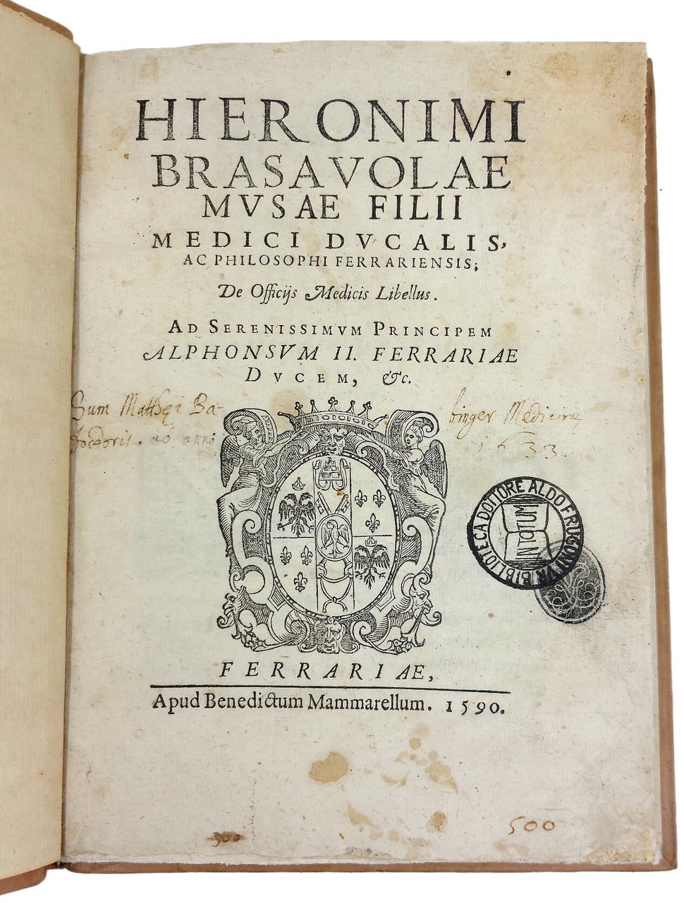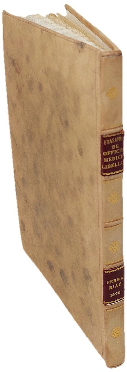 >in-4, ff. (4), 50, graziosa legatura moderna p. pelle, duplice tassello in pelle con titolo e fregi oro al dorso. Sul frontespizio stemma del Duca di Ferrara Alfonso II d'Este, cui l'opera è dedicata. Iniziali e fregi xilogr. Prima ed unica edizione di quest'opera molto rara, "volta a illustrare l'utilità e i compiti della professione medica. Il B. concorda con Ippocrate nel ritenere che la funzione del medico sia essenzialmente quella di amministrare e disciplinare i rimedi che la natura stessa suggerisce...Gli strumenti di ricerca del medico sono la ragione e l'esperienza...; i mezzi d'intervento a disposizione del medico sono poi la dieta, la farmacopea e la chirurgia" (DBIt., vol. 14, pp. 52-3). L'autore (Ferrara 1536-1594), figlio di Antonio Musa, fu professore di filosofia, medicina e lingua greca nell'ateneo ferrarese, poi medico primario alla corte di Alfonso II; talvolta viene confuso con un suo omonimo vissuto nel secolo successivo. Bell'esemplare (antica firma di proprietà e due timbri privati sul tit., lievissima ingiallitura sui primi fogli, piccolo restauro all'angolo inferiore del frontespizio). Manca a molti repertori consultati (Wellcome, Durling, Bibl. Osleriana, ecc.). Bibl. Walleriana 1423.