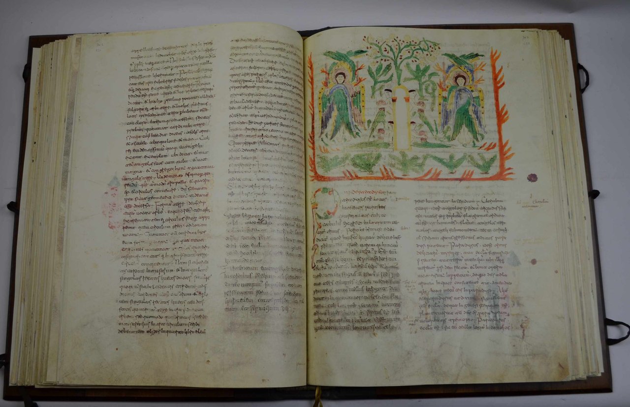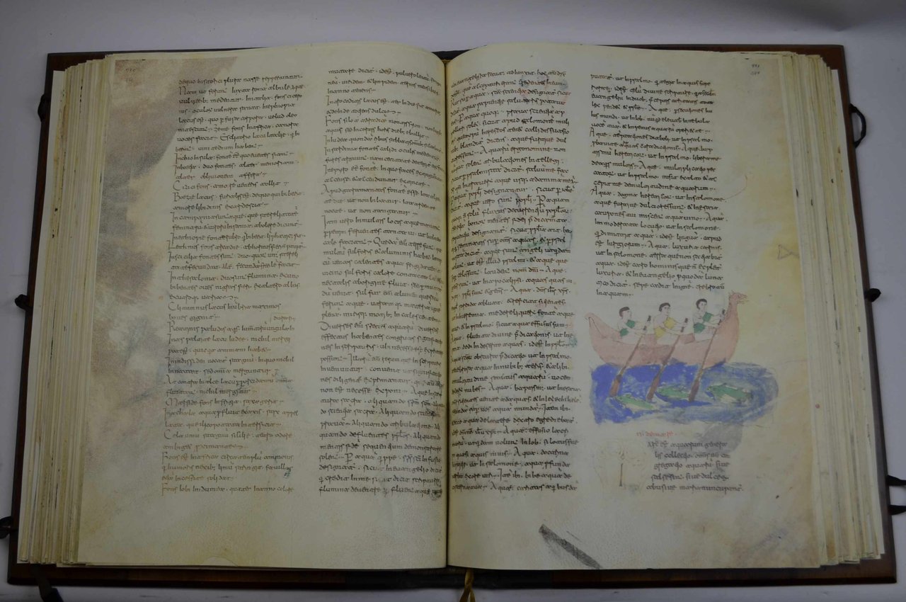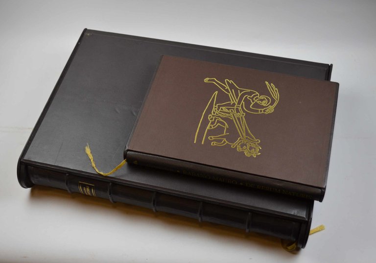 Cm. 49 x 35, pp. 530. Riproduzione in facsimile del codice interamente stampato da 8 a 12 colori. Sontuosa legatura editoriale in mezza pelle e piatti in legno con fermagli di chiusura in stoffa. Entro custodia in pelle. Solo qualche piccolo segno d'uso al cofanetto, peraltro ottima conservazione. Pregiata edizione che riproduce il Codice che si trova nell'Abbazia di Montecassino e che può essere considerato una vera e propria "Enciclopedia del sapere universale" del medioevo. Allegato: il volume di commentario che accompagna l'opera di cm. 33, pp. 216. Legatura in mezza pelle ed entro custodia. Il volumetto di Guglielmo Cavallo di pp. 47 (1) anch'esso dedicato all'opera. Tiratura limitata di 500 esemplari numerati (ns. n. 186).