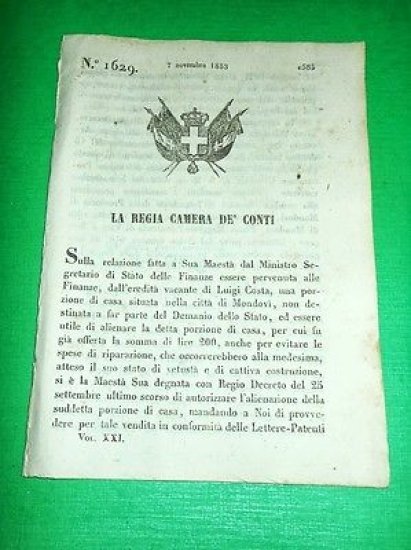*** Atti del Governo di S. M. il Re di Sardegna: Raccolta n. 1629 del 1853 con riferimento all' asta organizzata per l' eredità vacante del Sig. Luigi Costa di MondovìTorino, 7 Novembre 1853. Pagine 3.Per appassionati studiosi e collezionisti