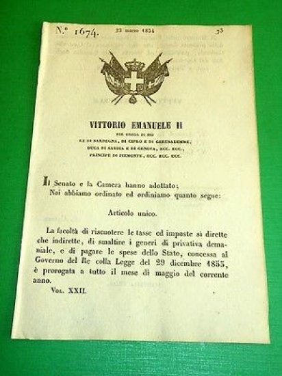 *** Atti del Governo di S. M. il Re di Sardegna: Legge , colla quale la facoltà concessa al Governo di riscuotere le tasse ed imposte si dirette che indirette , viene prorogata a tutto maggio ."Torino, 23 Marzo 1854. Pagine 2.Per appassionati studiosi e collezionisti"