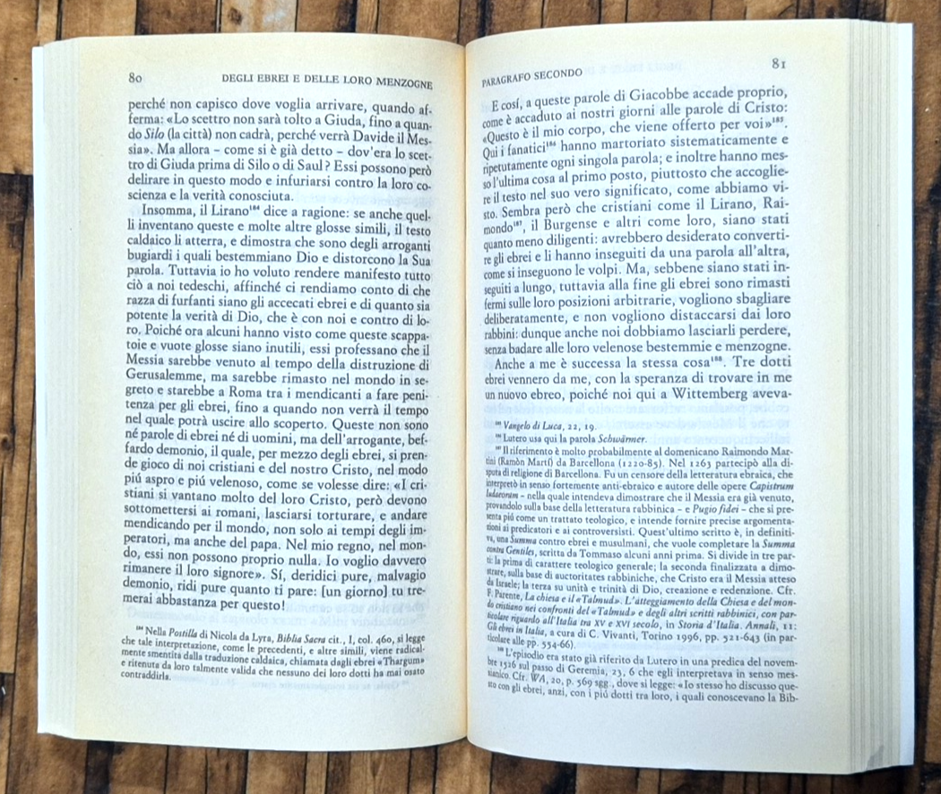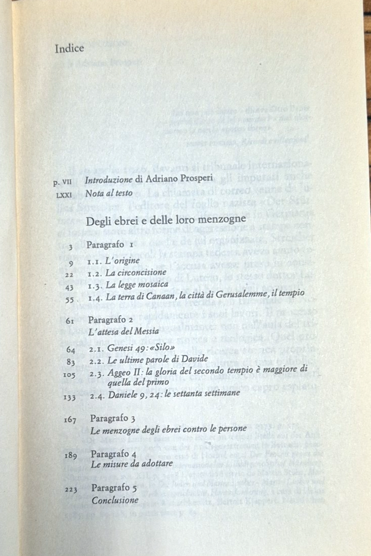 DEGLI EBREI E DELLE LORO MENZOGNE di Martin Lutero. Einaudi Tascabili, 2003. LXXII + 241 pagine, illustrazione in bianco e nero in antiporta. Copertina editoriale in brossura. Stato di conservazione: molto buono (pagine normalmente ingiallite).