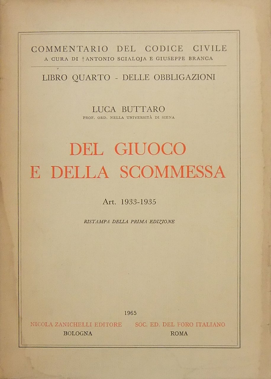 Del giuoco e della scommessa. Art. 1933-1935 | Libri antichi e moderni | Buttaro Luca