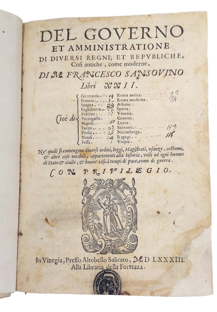 Del Governo et Amministratione di diversi Regni, et Republiche, così antiche, come moderne. Libri XXII. Ne' quali si contengono diversi ordini, magistrati, usanze, costumi, et altre cose notabili... | Libri antichi e moderni | SANSOVINO, Francesco.