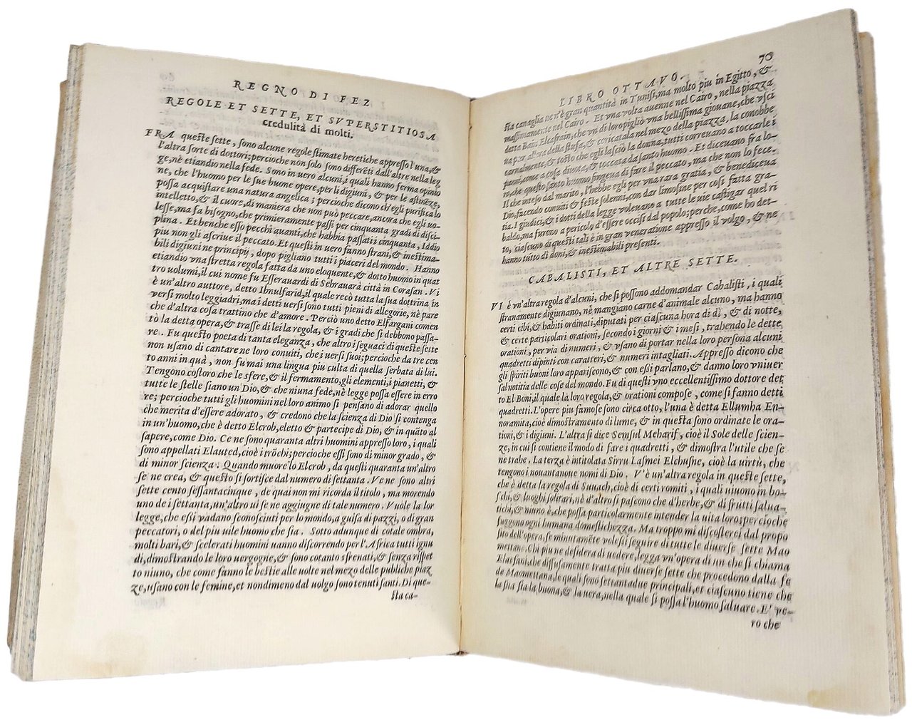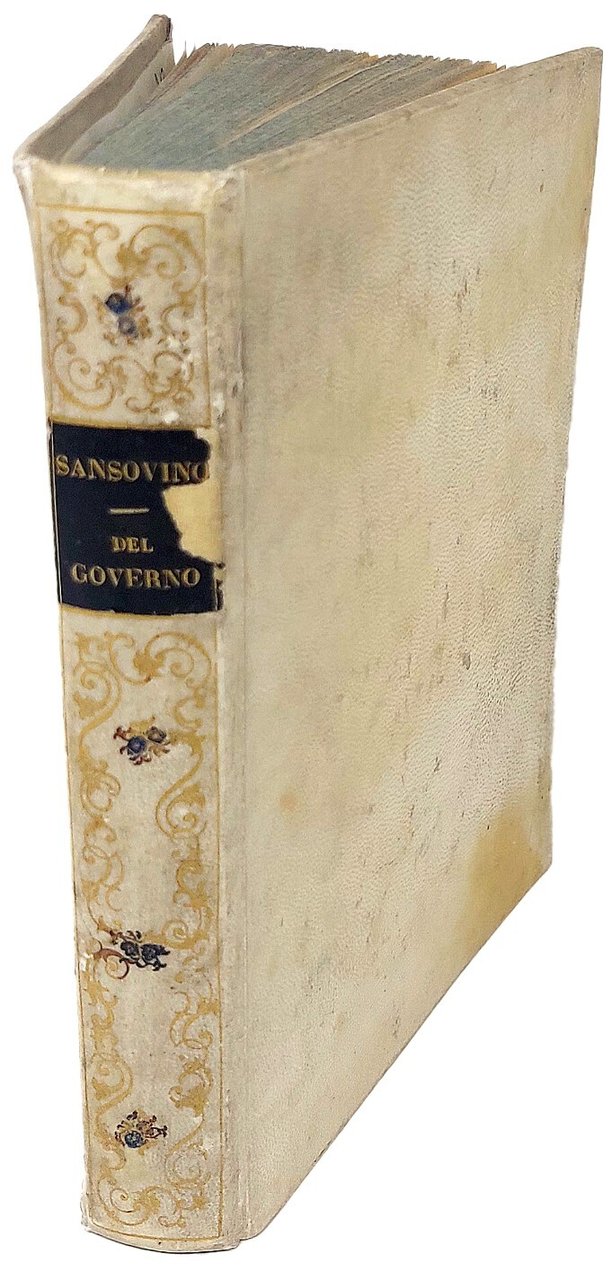 >in-4, ff. (8), 200. Legatura settecentesca in pergamena, titolo in oro su tassello e fregi oro al dorso. Impresa tipografica al titolo, fregi ed iniz. silogr., car. corsivo. Quarta edizione, in parte originale, essendovi stato aggiunto ''Del governo et amministratione del Regno di Napoli'' (inserito come libro XI), non compreso nelle precedenti edizioni. L'ultimo libro contiene, anche in quest'edizione, un sunto dell'Utopia di Thomas More. Opera d'interesse storico-politico che riguarda alcuni Stati italiani del tempo (Regno di Napoli, Stati della Chiesa, Rep. di Genova, Lucca e Venezia) e i principali Stati dell'Europa moderna, quali Francia, Germania, Spagna, Portogallo, Svizzera, Polonia; vi si tratta anche di regni asiatici (Persia e Turchia) ed africani (Tunisi e Fez). Fr. Sansovino (Roma 1521 - Venezia 1583), figlio del famoso scultore ed architetto Jacopo, fu stampatore, poligrafo e traduttore dal greco e dal latino. Esemplare puro (due lievi restauri marginali ed un timbro al front.).
