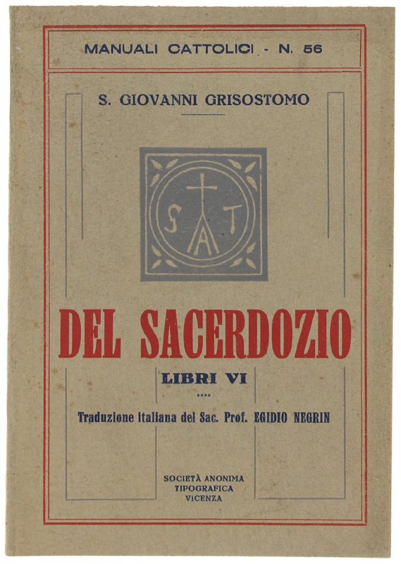 DEL SACERDOZIO libri VI. Traduzione del sac. Egidio Negrin. | Libri antichi e moderni | Giovanni Crisostomo (San)