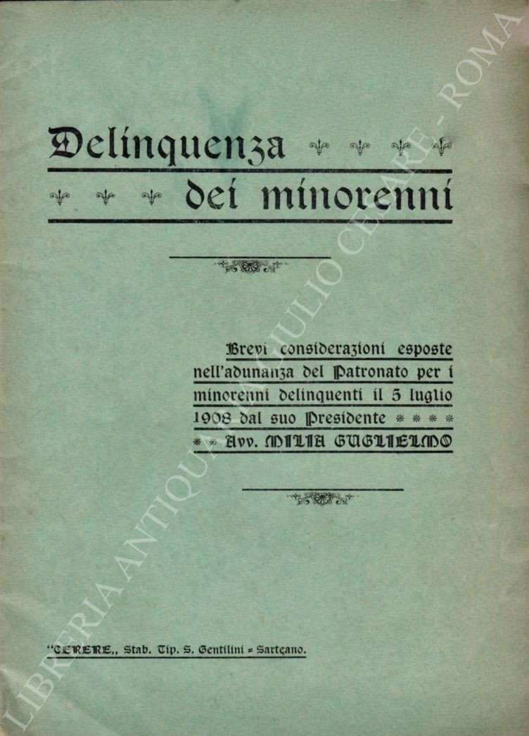 Delinquenza dei minorenni. Brevi considerazioni esposte nell'adunanza del Patronato per i minorenni delinquenti il 5 luglio 1908 dal suo Presidente Avv. Milia Guglielmo | Libri antichi e moderni | Milia Guglielmo