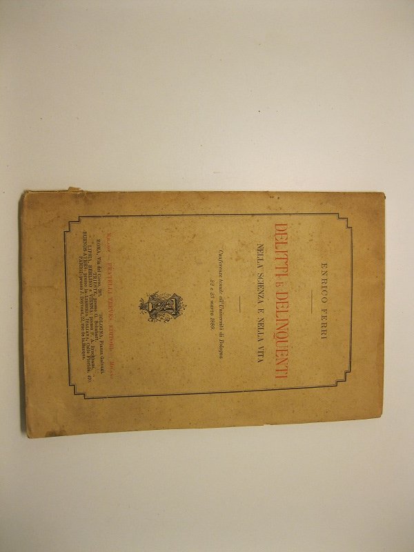 In 16, pp. 81 + (3b). Intonso. Br. ed. Ed. orig. Enrico Ferri (1856-1929) fu uno dei principali criminologi italiani e mondiali, allievo di Lombroso. In questo discorso avalla l'idea di tre studiosi stranieri, von Liszt, Prins e Van Hamel, di istituire una Unione internazionale di diritto penale con lo scopo di combattere la criminalita' intesa come fenomeno sociale. La scienza criminale e le leggi penali, inoltre, dovranno tenere conto degli studi antropologici e sociologici sulla delinquenza. Wigmore, A Preliminary Bibliography of Modern Criminal Law and Criminology, p. 30.