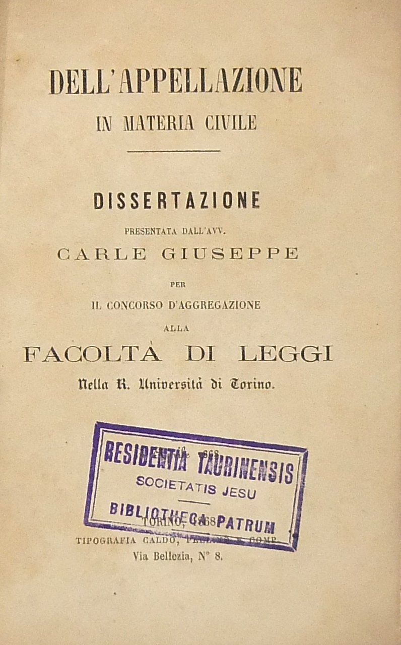 Dell'appellazione in materia civile. Dissertazione. | Libri antichi e moderni | Carle Giuseppe (1845-1917)