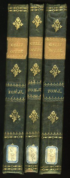 Orazione di Michele Capri Calzaiuolo nella morte di Gio. Battista Gelli, Allo illustrissimo ed eccellentissimo signore il Signore Cosimo de' Medici Duca di Firenze 21x12.5 cm., XXVI, 225, [3] ; X, 272, [2] ; XXVI, 103, 73, [2] pp., marca al frontespizio, ritratto dell'autore all'antiporta del primo volume, legatura in mezza pelle con angoli in pergamena, al dorso tasselli con titoli e fregi dorati, annotazioni manoscritte ai margini, dedica manoscritta alla sguardia del primo volume datata 1857, buon esemplare, in italiano Edizione completa delle opere del letterato fiorentino. Nel terzo volume catalogo completo delle opere di Gelli.